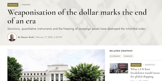 “Weaponisation of the dollar marks the end of an era”, Op-ed in Arabian Gulf Business Insight (AGBI), 17 Feb 2026