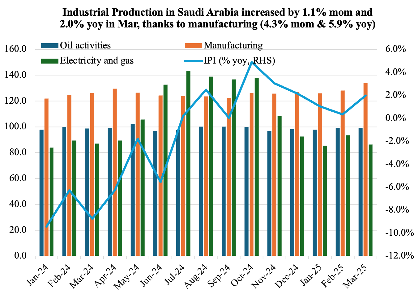 - Industrial production in Saudi Arabia increased by 1.1% mom and 2.0% yoy in Mar (Feb: 1.7% mom & 0.3% yoy). This was supported by a surge in manufacturing (4.3% mom and 5.9% yoy) whileoil activities ticked up moderately (0.1% mom and 0.5% yoy).