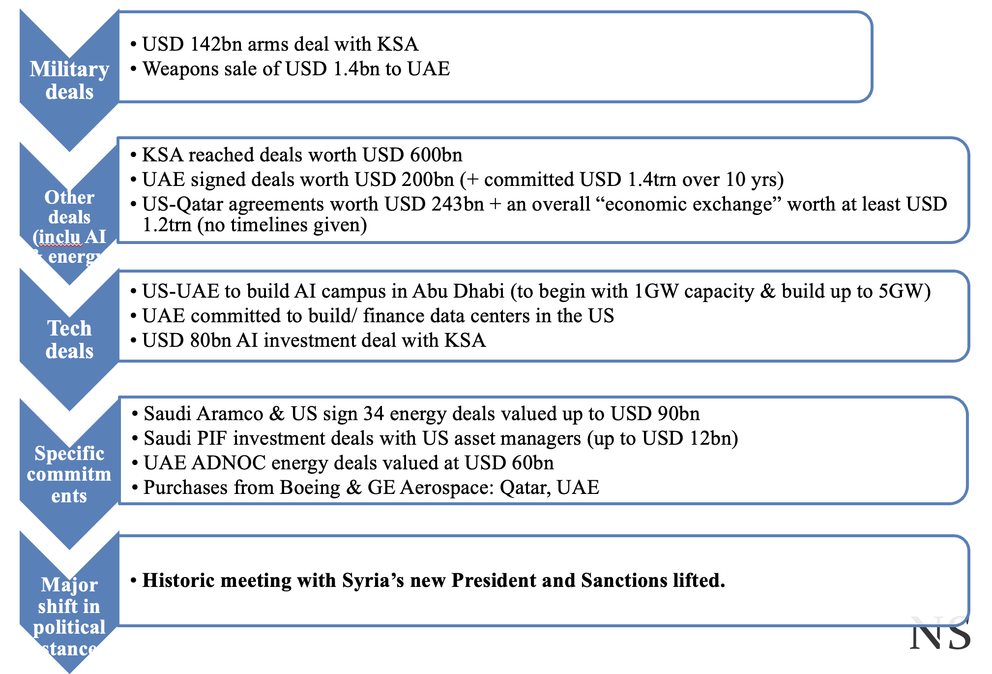 More than USD 1.4trn in investment pledged by Saudi, Qatar & UAE. For the US, these deals are a way of countering China’s influence in the region.