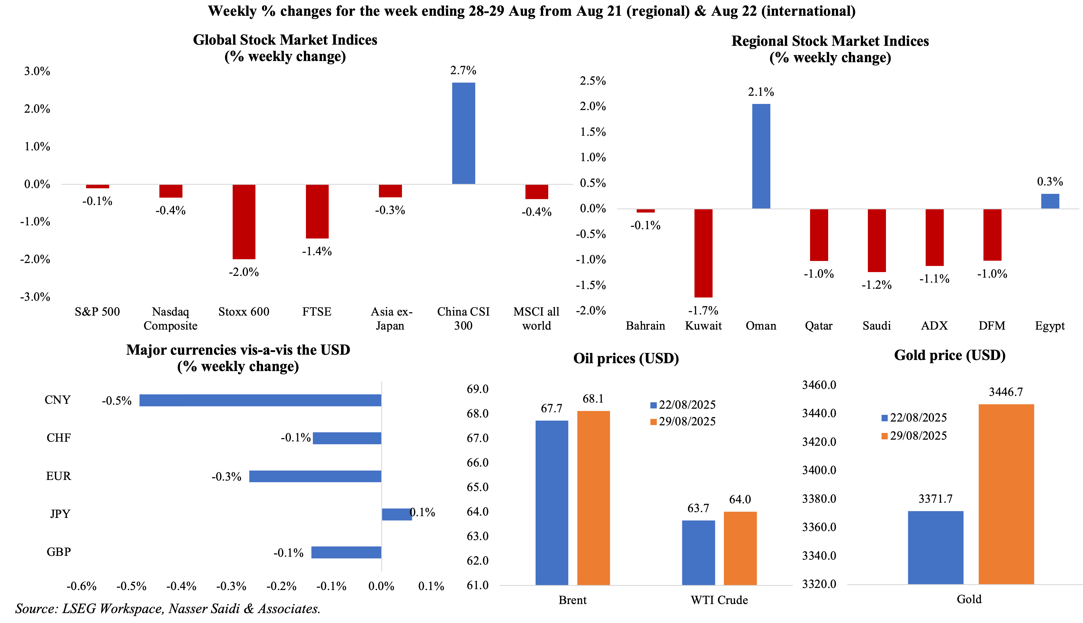 Global equities markets had a rough week, with a drop in technology and AI-related shares, and investors remaining cautious ahead of economic data that could determine the Fed’s next move. Markets in the Gulf also mirrored the global trend, except for Oman which crossed the 5000-mark for the first time in nearly eight years (reflecting investor confidence in the economy given ongoing economic reforms) while Egypt benefitted from news about a “partnership package” with Qatar. Among currencies, the Indian rupee dropped to a record low after US hiked tariffs (to 50%) while the Chinese yuan was the strongest vis-à-vis the USD in 10 months. Oil prices were moderately up (0.5%+ from a week ago), while gold price climbed more than 2% (inching closer to a record USD 3500) on increased expectations of a rate cut this month.