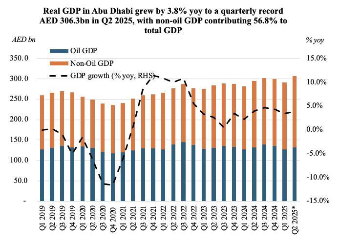 - Real GDP in Abu Dhabi grew by 3.8% yoy to AED 306.3bn in Q2 2025 (Q1: 3.4%), supported by robust non-oil sector activity (a quarterly record AED 174bn, up 6.6% yoy). Contribution of non-oil sector stood at a record high 56.8% of total GDP, highlighting broad-based diversification. Nine of the sixteen economic activities posted the highest-ever quarterly value in Q2, including manufacturing, financial, real estate & construction.