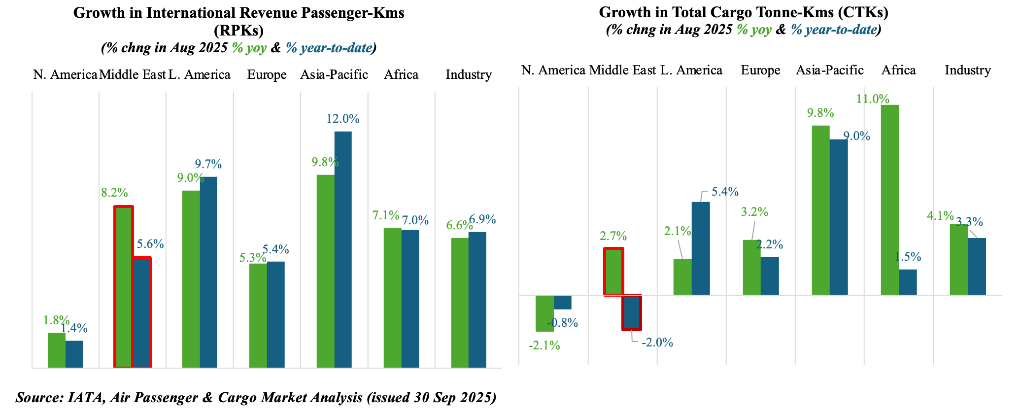 - International revenue passenger-kilometers (RPKs) growth in Aug (6.6% yoy) was driven by the Asia-Pacific region (9.8%, thanks to China and Japan markets). Middle East airlines experience was also strong, up 8.2% in Aug, with the Middle East-Asia travel corridor posting a gain of 8.5%. Year-to-date gains in the Middle East was slightly muted (5.6% during the year vs industry average of 6.9%), underscoring the impact from ongoing regional conflicts.