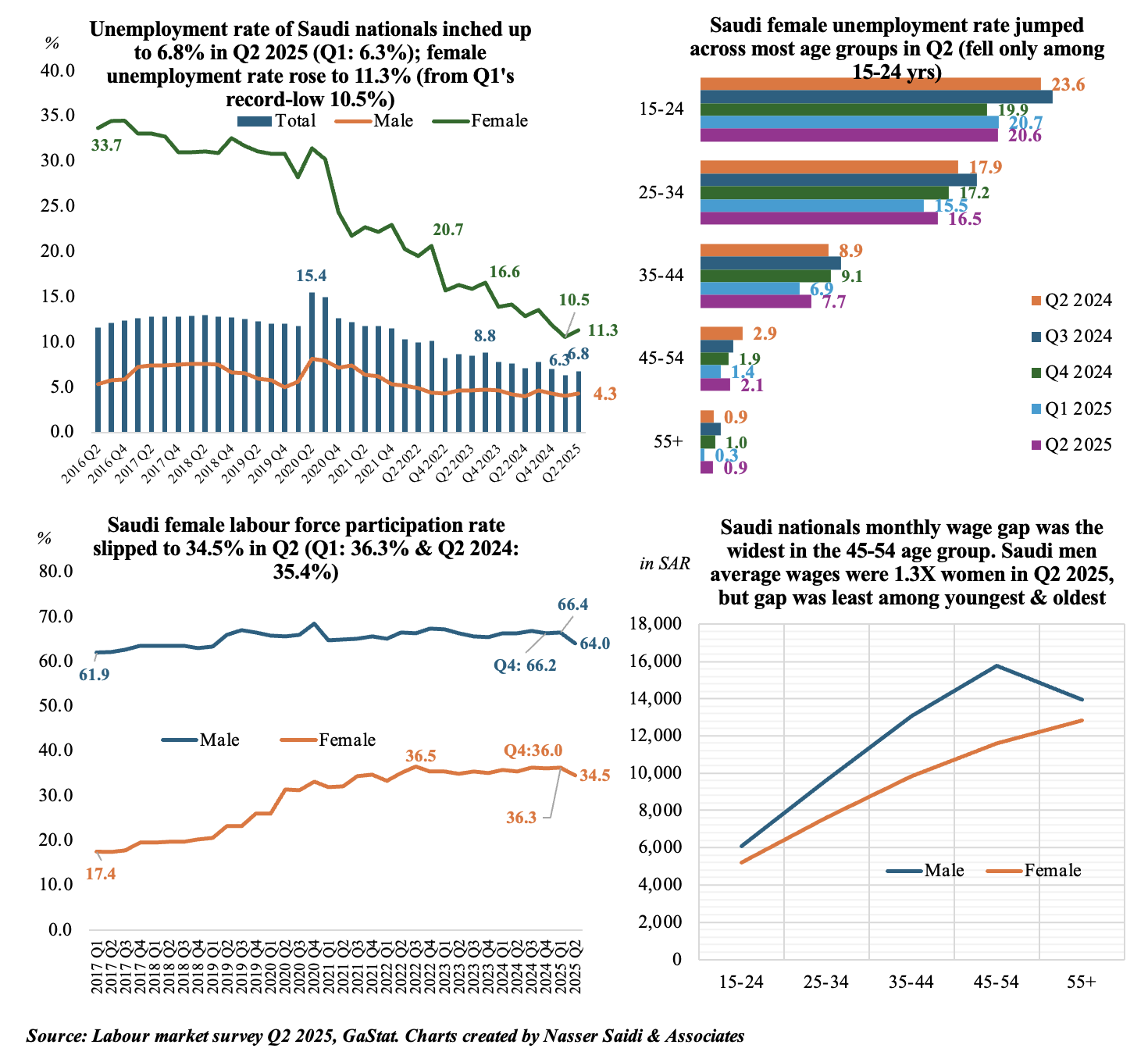 - Saudi female unemployment rate increased to 11.3% (Q1: 10.5%). All groups (except 15-24 age) saw an increase in unemployment rate (vs Q1); readings are lower vs a Q2 ‘24. The improvement in 15-24 age group is promising: hinting at success of the “Early Work” initiative or possibly public-private partnership programs targeting entry-level jobs.