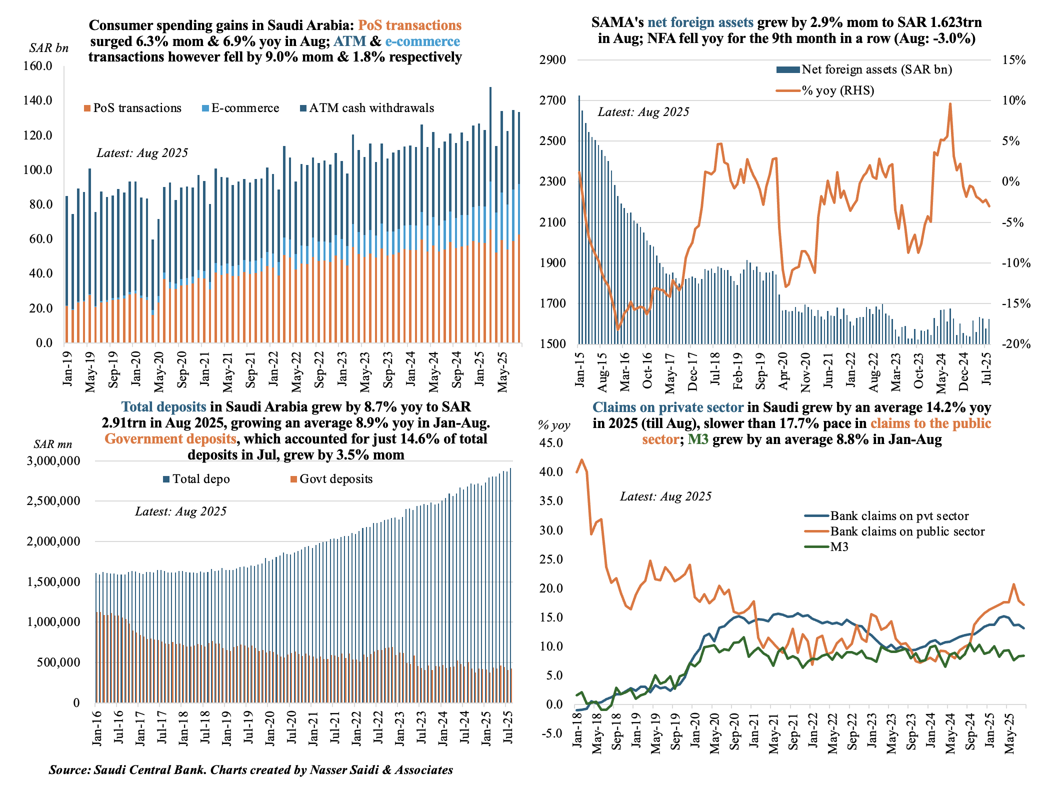 2. Deposit growth in Saudi Arabia averaged 8.9% in Jan-Aug 2025; credit growth outpaced deposit growth for the 19th straight month in Aug. In yoy terms, NFA fell for 9th consecutive month. Consumer spending inched lower, dragged down by ATM & e-commerce transactions