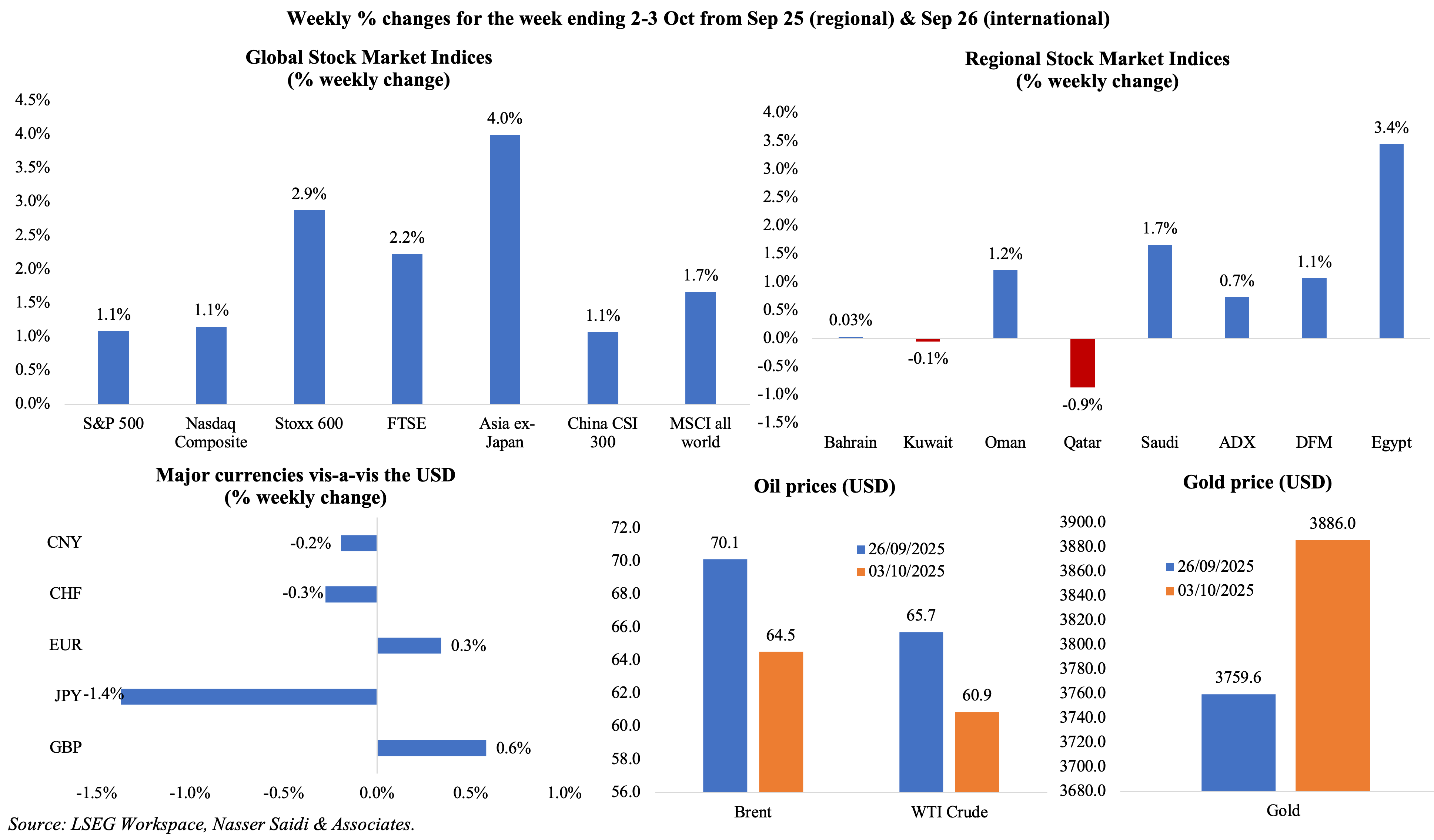 Major equity markets gained last week, with US markets at new record highs despite the US government shutdown and related delays in key data releases. Positive PMI releases brought some cheer to European markets while Taiwan and Japan (ahead of the weekend vote to determine the new PM) supported Asian gains. Regional markets had a good week, mostly up, with Saudi Arabia and UAE’s DFM and ADX ending the week 1.7%, 1.1% and 0.7% higher respectively. On the currency front, the dollar continued to weaken which affected the JPY; the Indian rupee is at near record lows. Oil prices fell by more than 8% from a week ago, on concerns of oversupply (in anticipation of OPEC+ further unwinding of production cuts). Gold price continued its safe-haven role, completing a 7th consecutive week of gains, and inching closer to the USD 4,000 a troy ounce mark (from just above USD 2,600 at the start of the year).