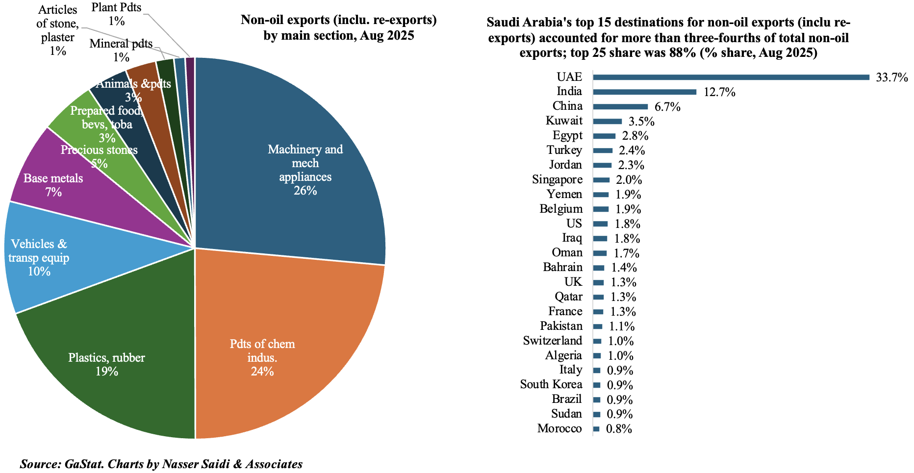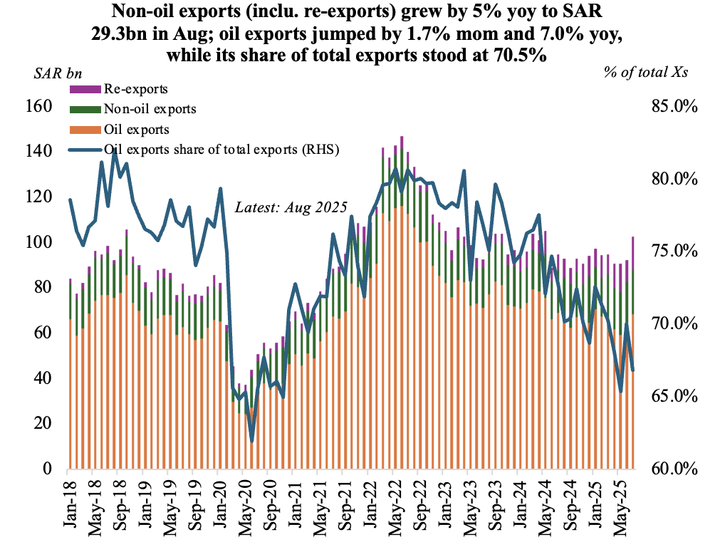 - Imports fell by 9.1% mom to SAR 74.9bn in Aug 2025 (but was up 7.4% yoy). This resulted in a wider trade surplus – SAR 24.2bn vs Ju1’s SAR 20.4bn and Aug 2024’s SAR 23.3bn.