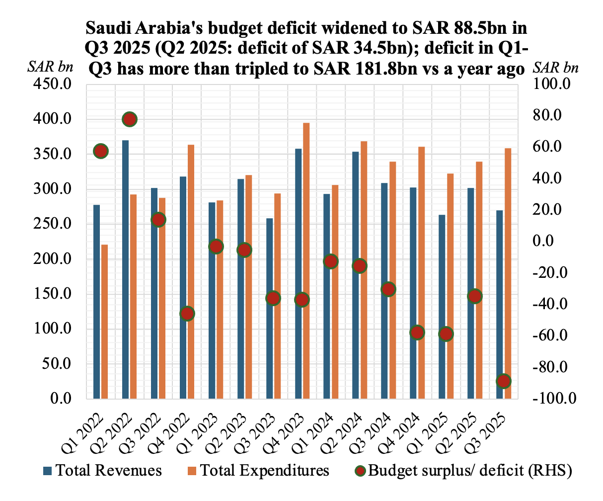 - Saudi fiscal deficit widened to SAR 88.5bn in Q3 2025 (Q3 2024: SAR 30.2bn), bringing the total deficit this year to SAR 181.8bn from SAR 58.0bn in Q1-Q3 2024.
