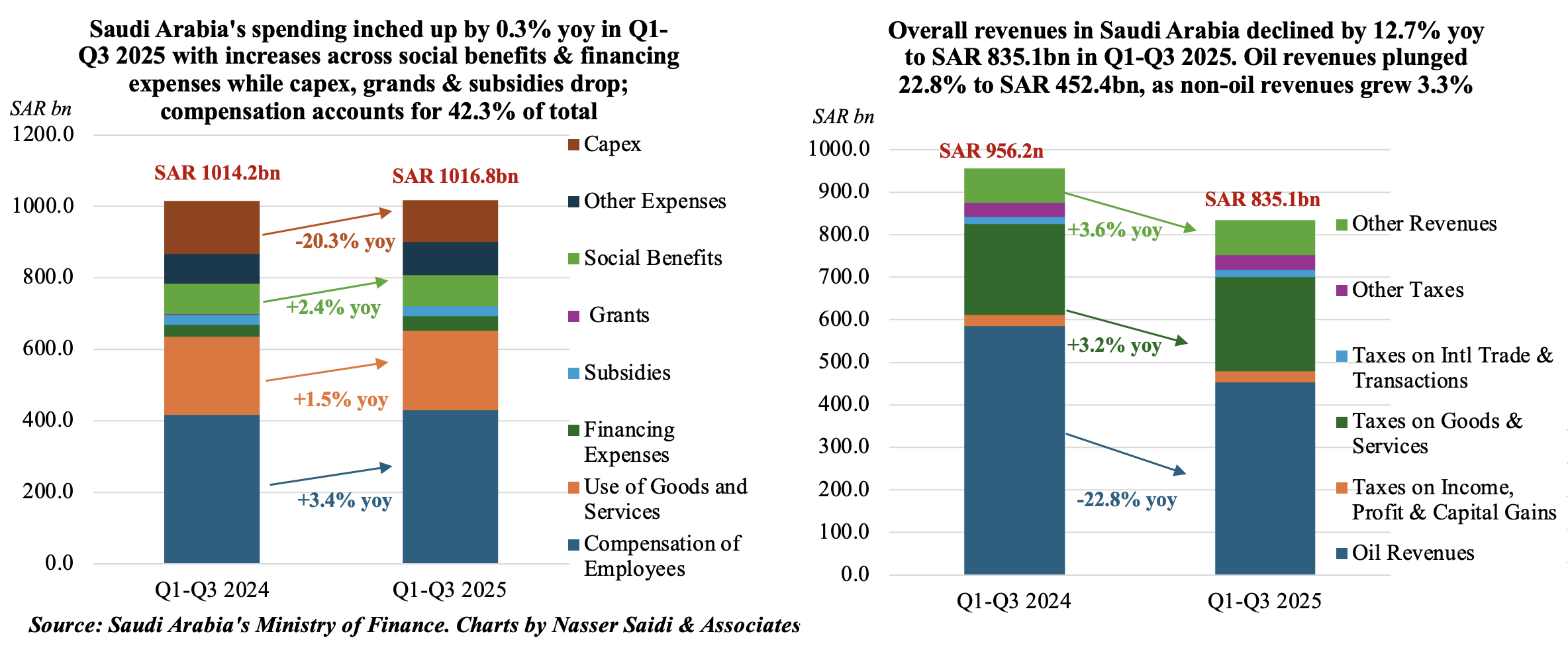 3. Saudi budget deficit widened in Q3 2025 as oil revenues plunged; fiscal deficit more than tripled to SAR 181.8bn in Q1-Q3 2025 from a year ago.