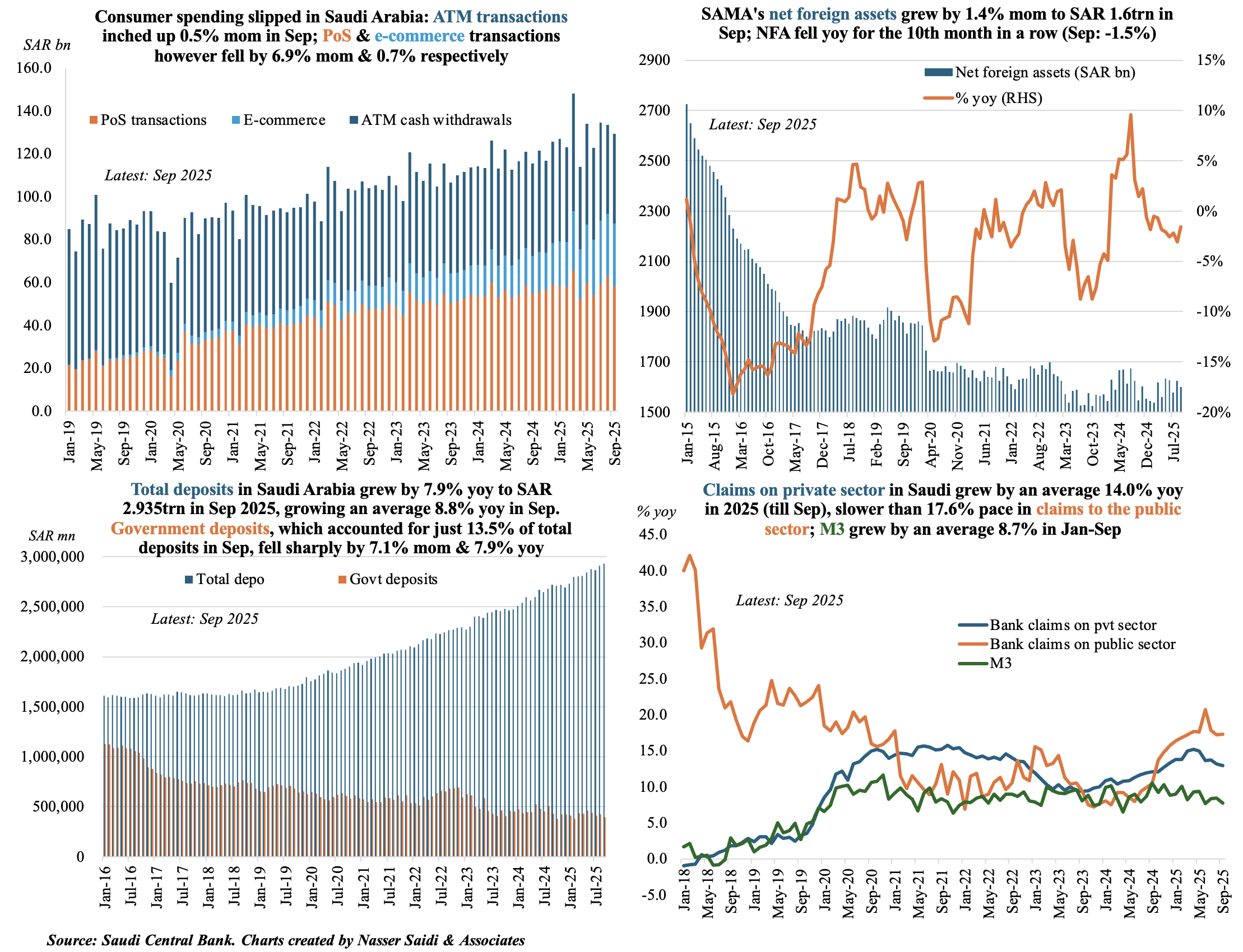 2. Consumer spending inched lower for the second consecutive month in Sep, as PoS transactions fell by a sharp 6.9% month-on-month. In yoy terms, NFA fell for 10th month running. Deposit growth in Saudi Arabia averaged 8.8% in Jan-Sep; credit growth outpaced deposit growth for the 20th straight month in Sep.