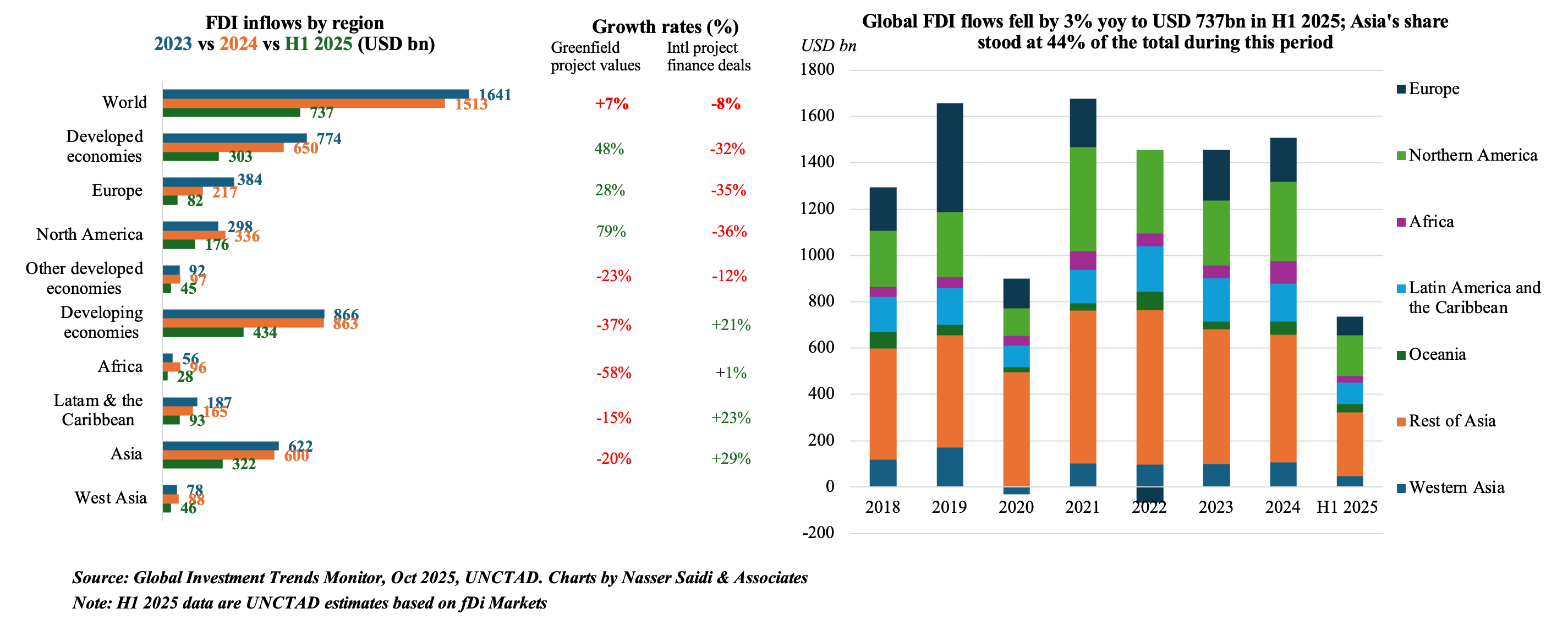 5. Global FDI flows tumbled by 3% yoy to USD 737bn in H1 2025; Latam, Asia and North America posted yoy gains