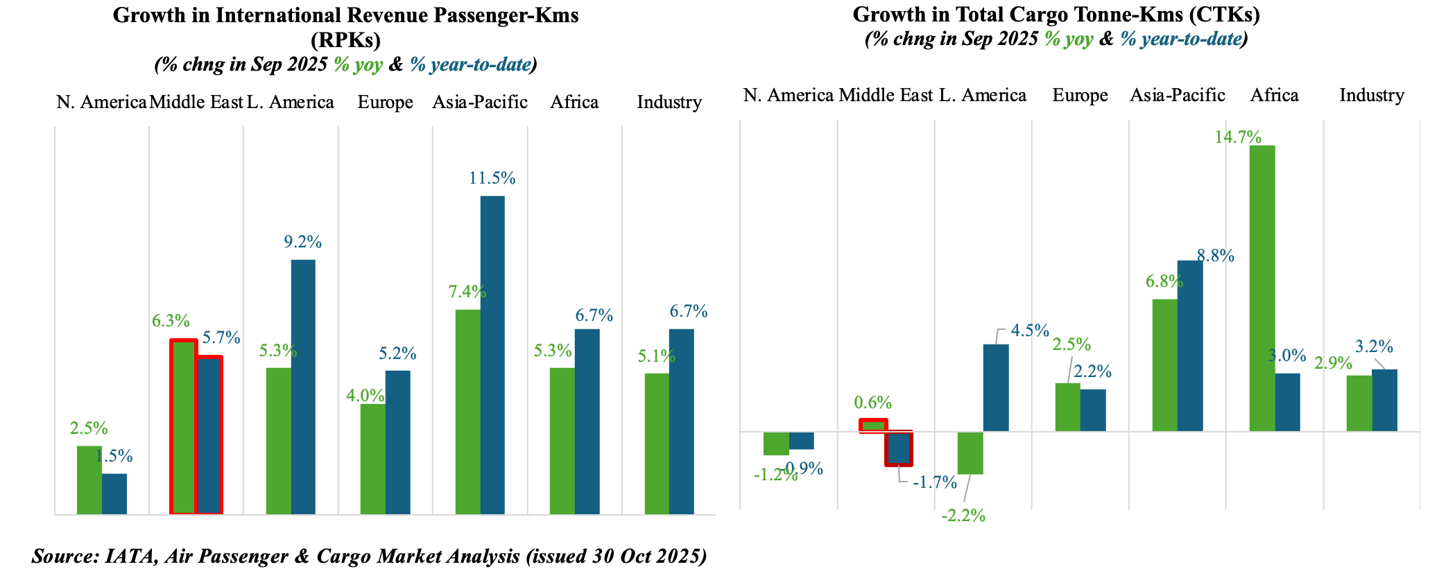 - Air cargo demand remained relatively resilient in the backdrop of tariffs uncertainty. Cargo tonne-kms (CTKs) grew by 2.9% yoy in Sep, posting the 7th straight month of growth, and was up 3.2% year-to-date. Middle East carriers cargo demand grew by 0.6% yoy in Sep, much than the 2.6% clocked in Aug, and was down by 1.7% so far this year. This weakness is being driven by a sharp deterioration in the Middle East-Europe trade route, which fell 4.6% in September. However, the Middle East-Asia cargo corridor grew by 4.6% in Sep; this was also one of the three corridors that posted a positive growth of 4.1% in 2025 year-to-date.
