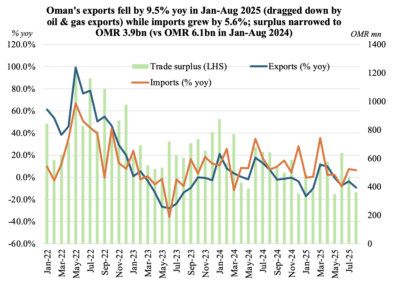 - Oil and gas exports accounted for around two-thirds of Oman’s overall exports in Jan-Aug (63.8%). Exports fell by 9.5% yoy to OMR 15.3bn (as oil & gas exports plunged by 16.8% yoy to OMR 9.8bn). Imports increased by 5.6% to OMR 11.4bn – resulting in a narrower trade surplus (OMR 3.9bn in vs OMR 6.2bn in Jan-Aug 2024).
