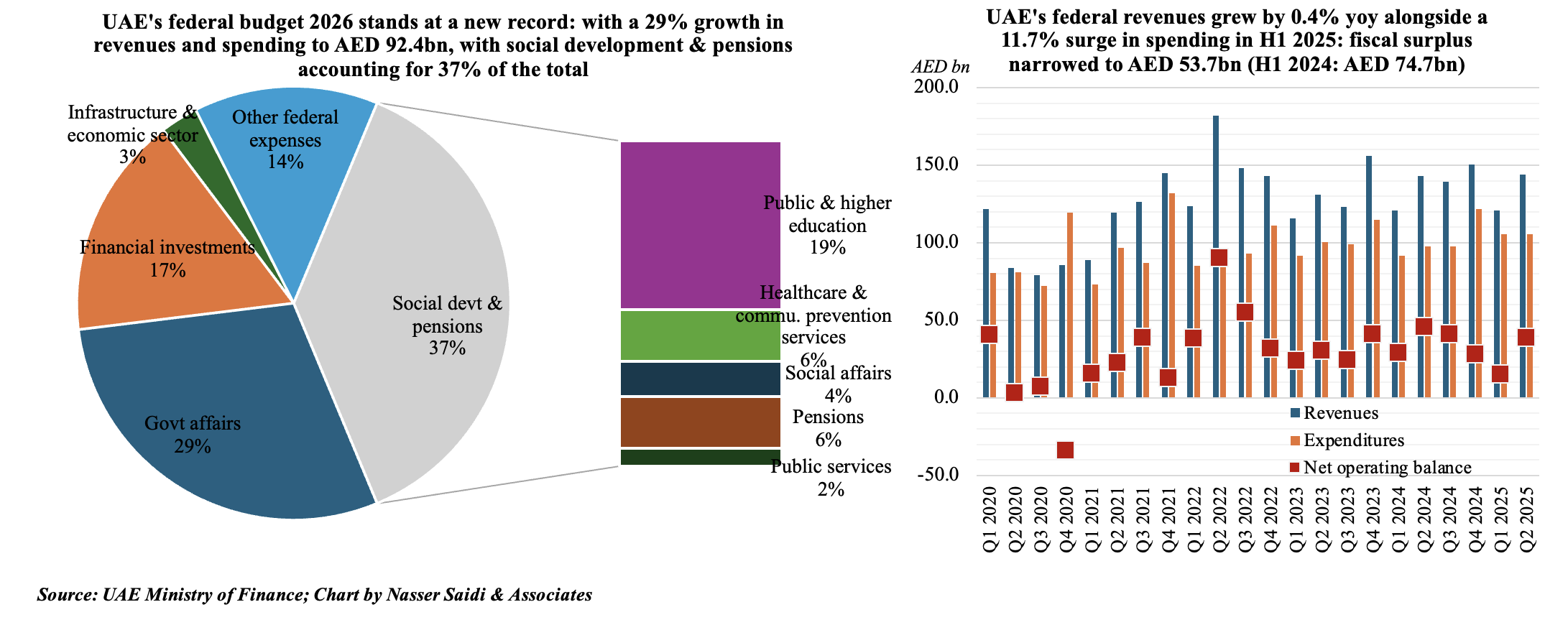 - The UAE Cabinet approved the largest-ever federal budget of AED 92.4bn for 2026, surpassing the 2025 budget of AED 71.5bn (+29% yoy). Social development and pensions together accounted for 37.5% of the federal budget in 2025.