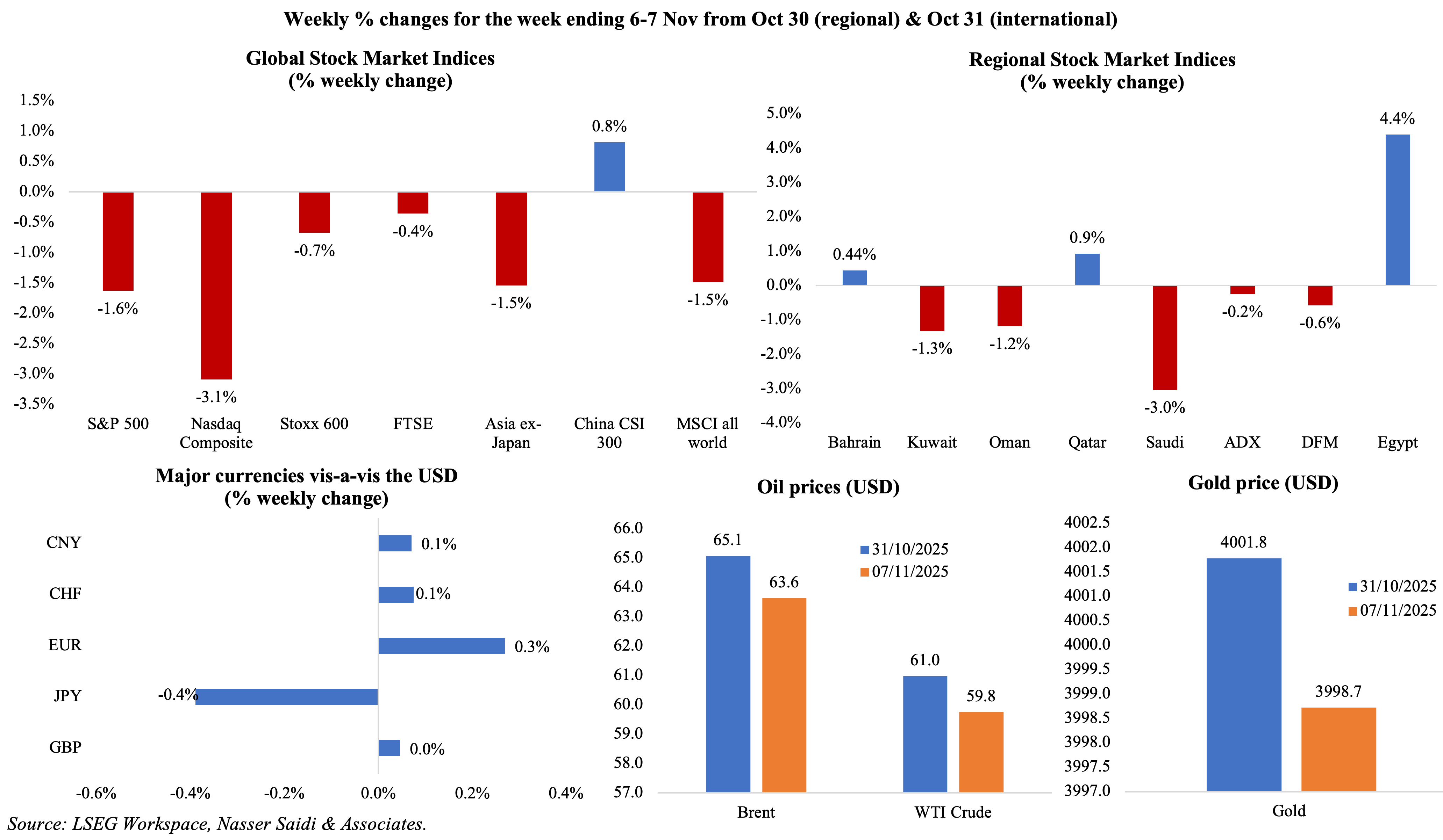 Major markets saw selloffs following weeks of new record highs after elevated valuations and concentration of the AI and tech stocks led to market jitters. Eight of the most valuable AI related stocks lost about USD 800bn since end of the week prior, according to FT. Stoxx closed 0.7% lower, with tech stocks bearing the brunt while in the UK, FTSE’s loss stemmed from corporate earnings and the Bank of England’s rate decision. Regional markets were mostly down, except for Egypt which jumped to a new record high (following news about an Egypt-Qatar partnership deal on a real estate and tourism project). The JPY hit a new 8-month low versus the greenback last week and GBP is at its weakest since 2023 against the euro. Oil prices continued to decline on worries about a supply glut amid slowing demand. Gold price ended the week slightly up as worries the extended US government shutdown supported to its safe-haven demand, but it closed the week lower.