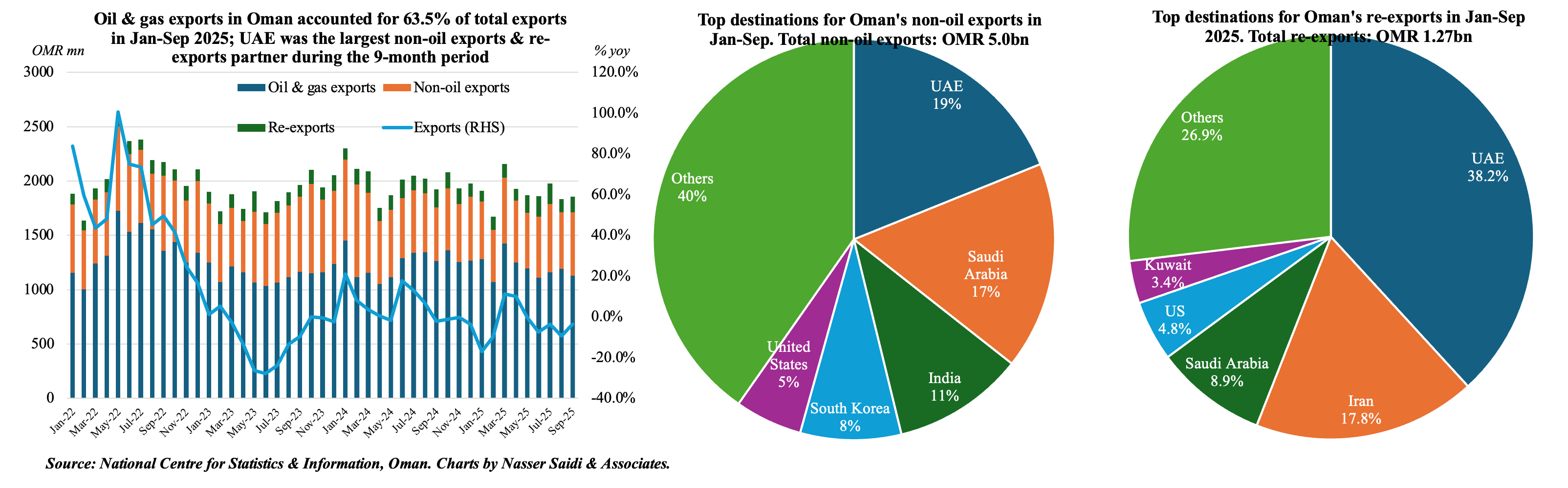- Non-oil exports grew by 10.3% yoy to OMR 5.0bn in Jan-Sep, comprising mineral products (OMR 1.29bn, down 1.3% yoy, but accounting for 7.5% share of exports).