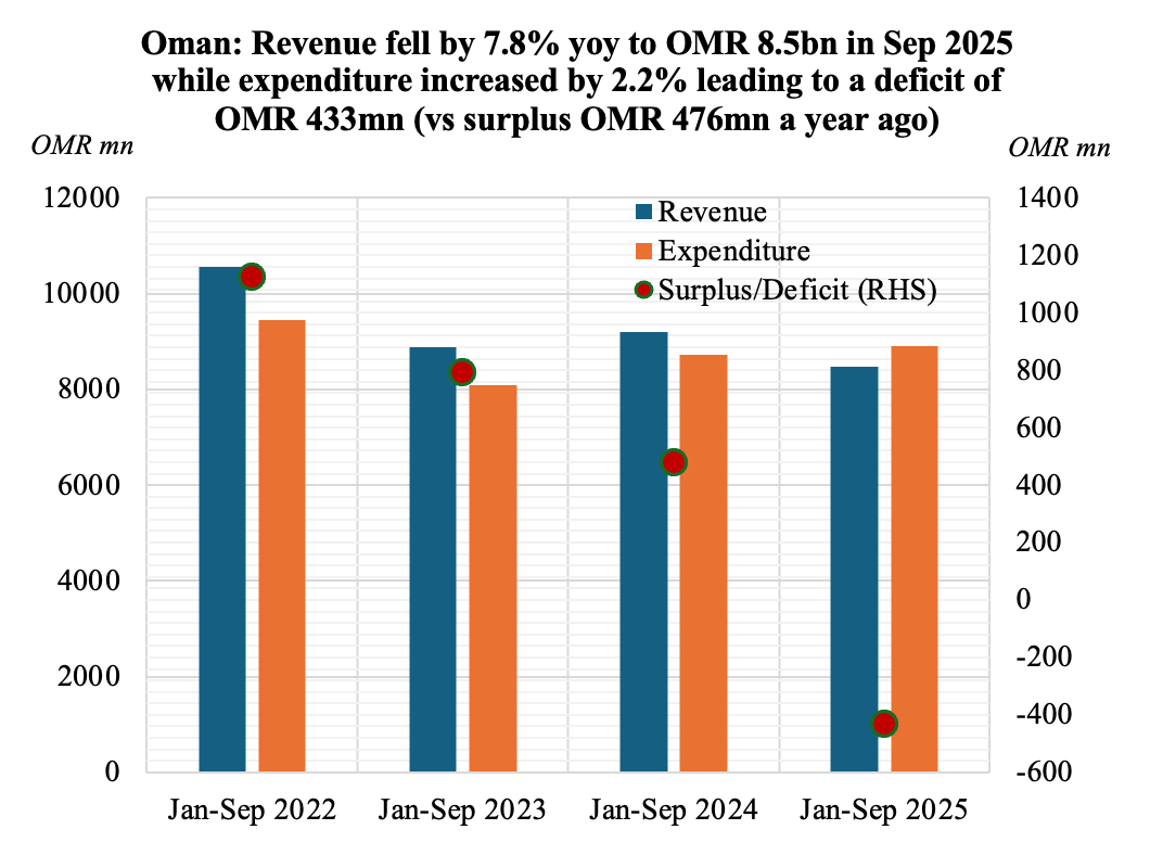 3. Oman’s fiscal deficit of OMR 433mn as of end-Q3 2025 stands in contrast to a surplus of OMR 476mn in Jan-Sep 2024