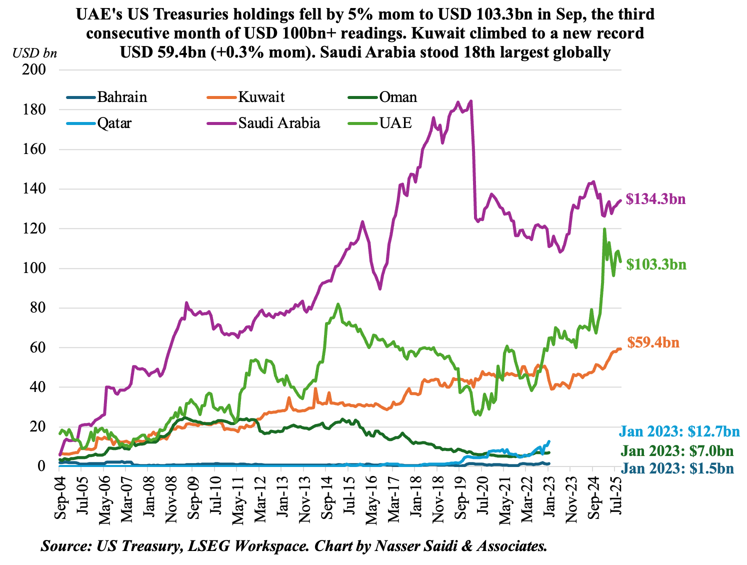 - Kuwait climbed to a new high of USD 59.43bn, up 0.3% mom & 23.1% yoy (previous high: USD 59.24bn in Aug 2025).