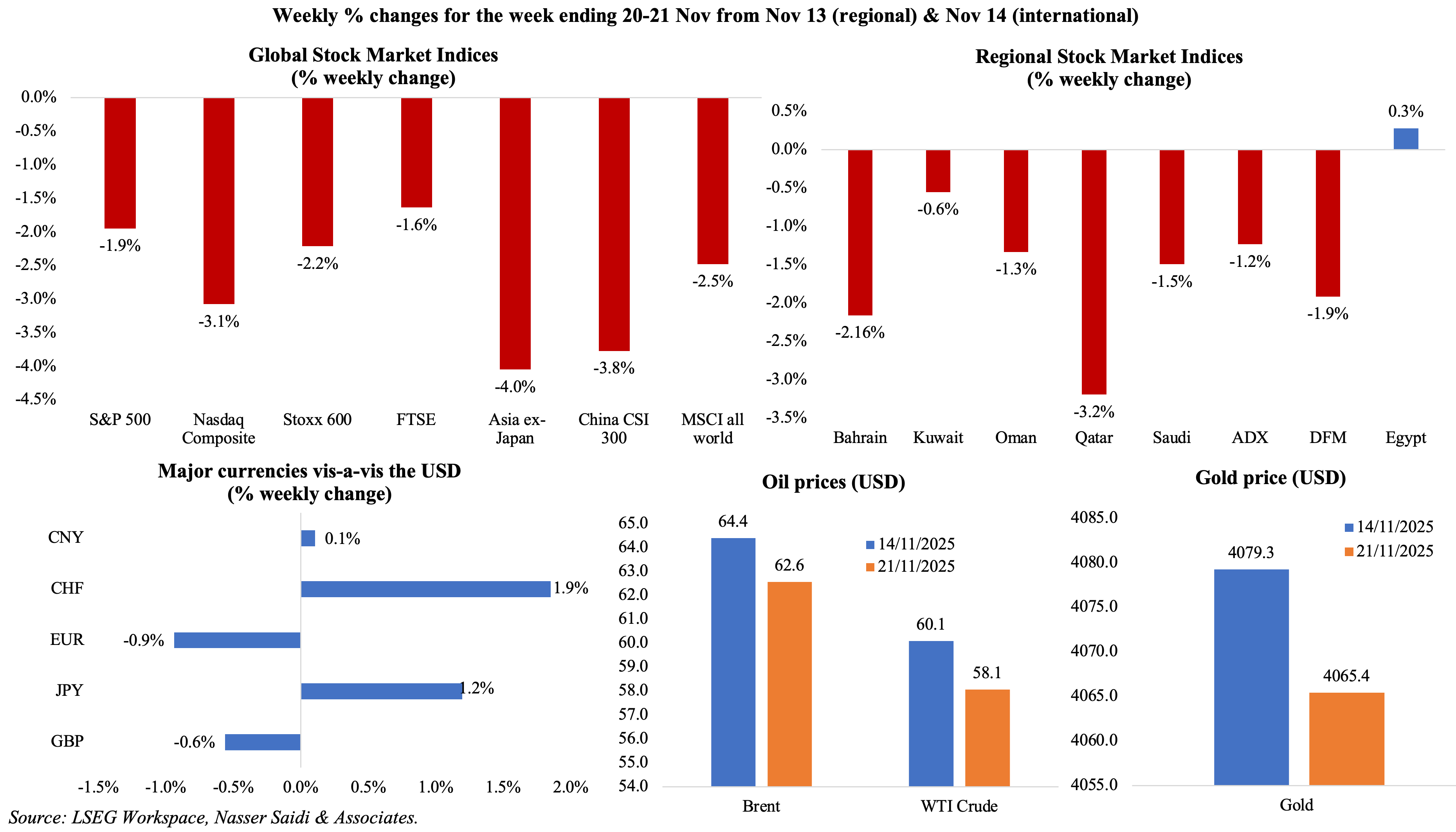 Major equities markets ended in the red, as concerns grew about tech valuations though rate cut expectations towards the end of the week led to a rally; in the UK, FTSE closed 1.7% lower versus a week before as investors wait for the budget announcement this week. These declines were mirrored in regional markets, with lower oil prices also weighing on the indices. The USD hit a 6-month high versus a basket of currencies last week; JPY slid to a 10-month low against the greenback, causing the Bank of Japan governor to signal a potential hike at the Dec meeting. Amid discussions about the proposed Russia-Ukraine peace deal, oil prices ended lower and gold slid slightly to close around USD 4,065 an ounce.