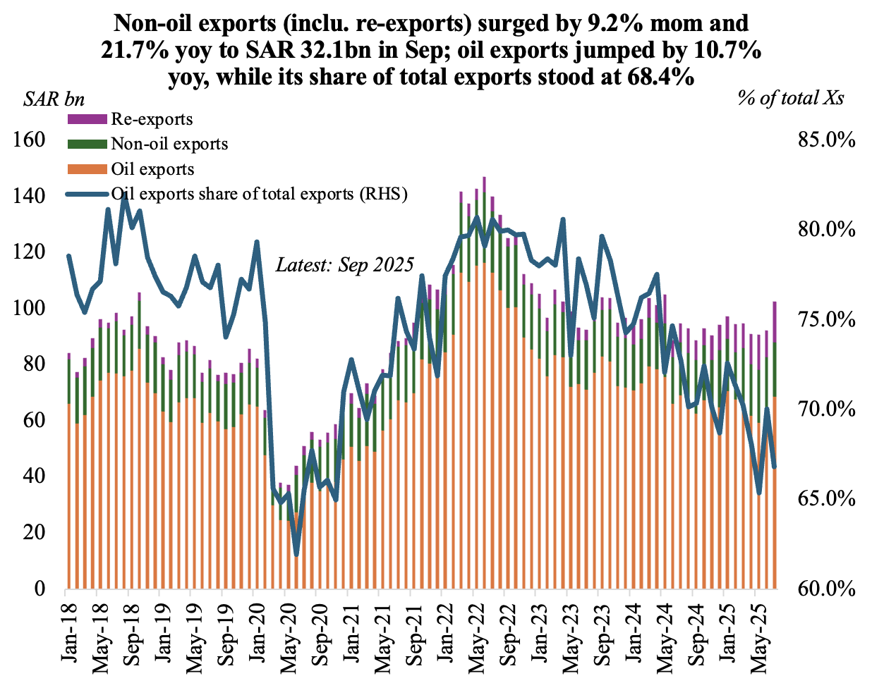 - Total non-oil exports (i.e. including re-exports) grew by 9.2% mom and 21.7% yoy to SAR 32.1bn in Sep. A breakdown shows that re-exports and domestic non-oil exports (i.e. excluding re-exports) grew by 7.7% mom and 10.1% mom to SAR 12.3bn and SAR 19.7bn respectively.