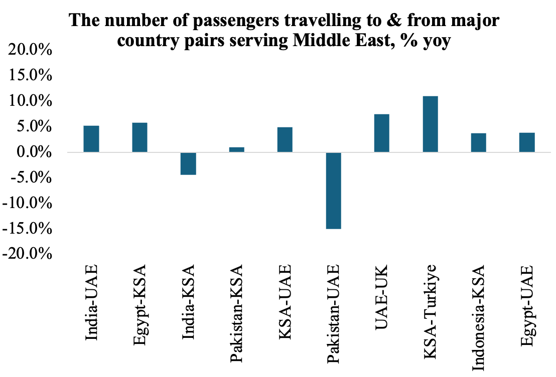 - India & Pakistan were the main Asian destinations for travellers from the Middle East: however, visitors to India grew (0.3% yoy) while it fell to Pakistan (-5.3%, given the 15% dip in UAE-Pakistan route). Türkiye (due to the strong KSA corridor) and Egypt (both with UAE & KSA) were the main connections to Europe & Africa respectively. Capacity is expected to rise further, given the demand & launch of new airlines (KSA).