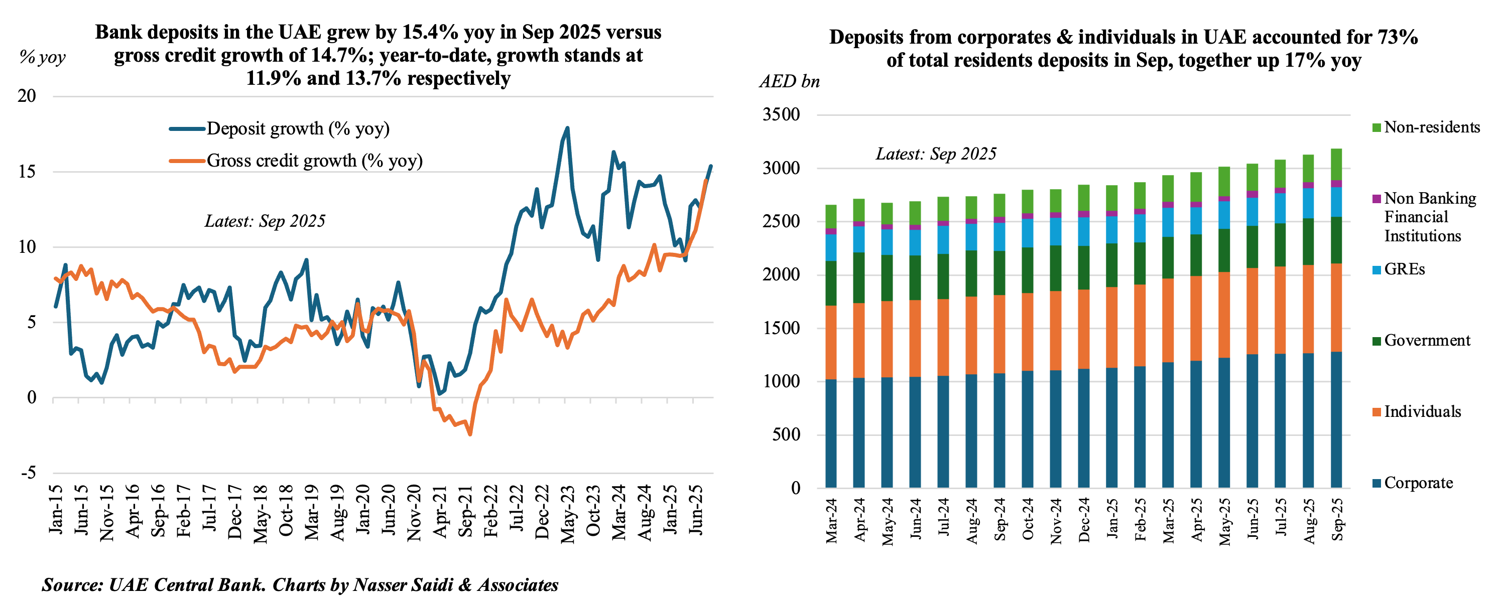 - Average growth in Jan-Sep 2025 of gross credit (11.2% yoy) and domestic credit (6.0% yoy) lagged overall deposit (12.2%) in the UAE. Year-to-date, both gross credit & bank deposits are up by 13.7% and 11.9% respectively.