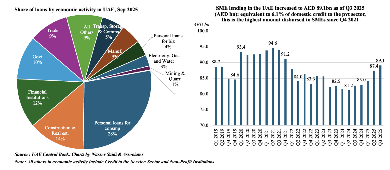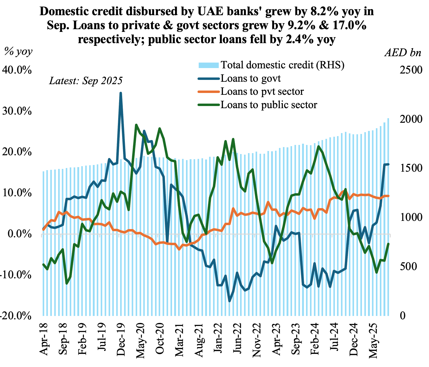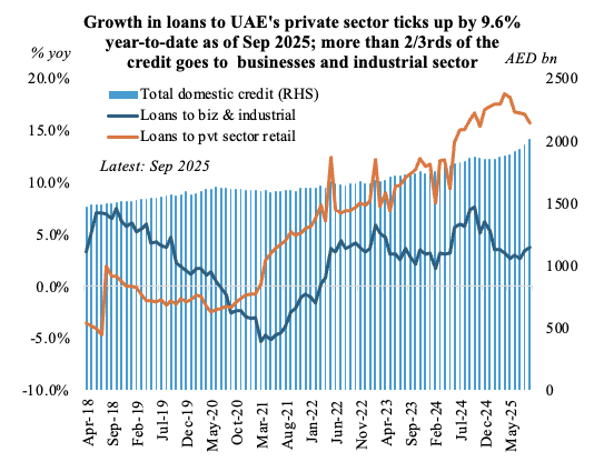- Loans disbursed to UAE’s business & industrial sector accounted for 45.8% of total domestic credit in Sep 2025. It grew by 3.7% yoy in Sep (& 5.6% year-to-date) versus a faster pace in the private retail sector (9.4% yoy and 15.7% ytd).