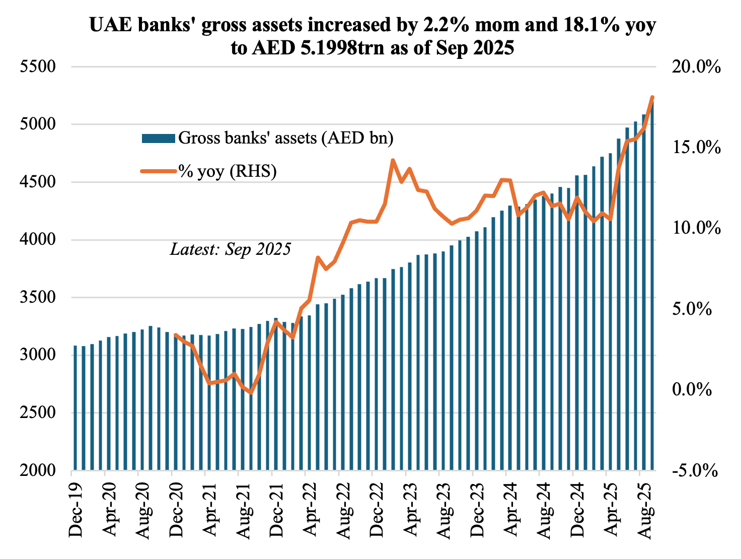 - Average growth in Jan-Sep 2025 of gross credit (11.2% yoy) and domestic credit (6.0% yoy) lagged overall deposit (12.2%) in the UAE. Year-to-date, both gross credit & bank deposits are up by 13.7% and 11.9% respectively.