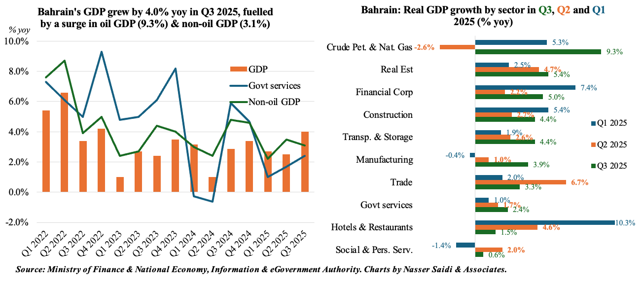 2. Bahrain’s GDP grew by 4.0% yoy in Q3, largely owing to an oil sector boost (9.3% in Q3) while non-oil GDP was up 3.1%