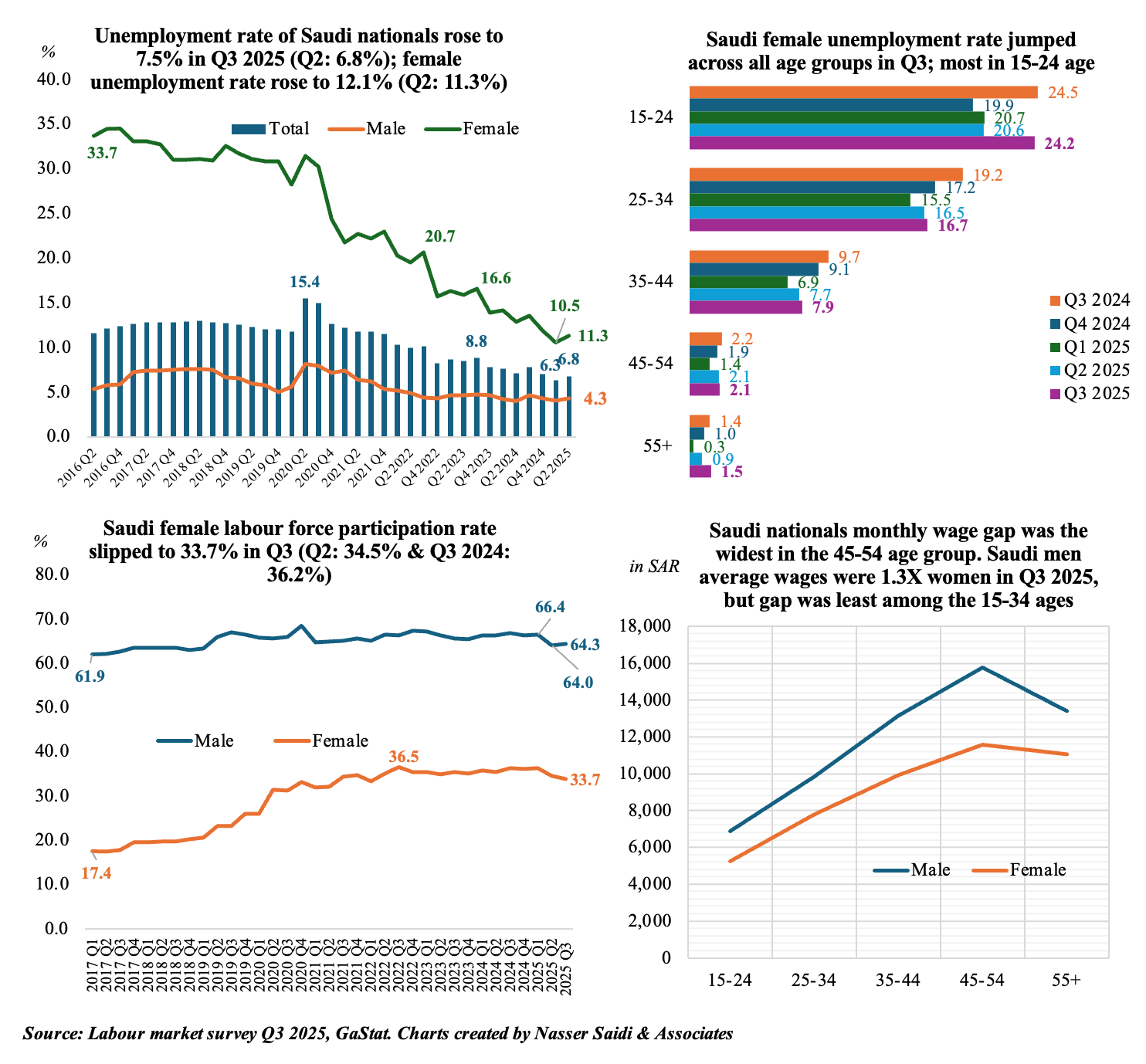 - Wage gap remains persistent. Female citizens’ wages averaged SAR 9,180 in Q3, up 0.8% qoq (men: SAR 11,862, up 1.4% qoq); wages of women aged 45-54 was highest (SAR 11,588), also seen previously in Q3 2024.