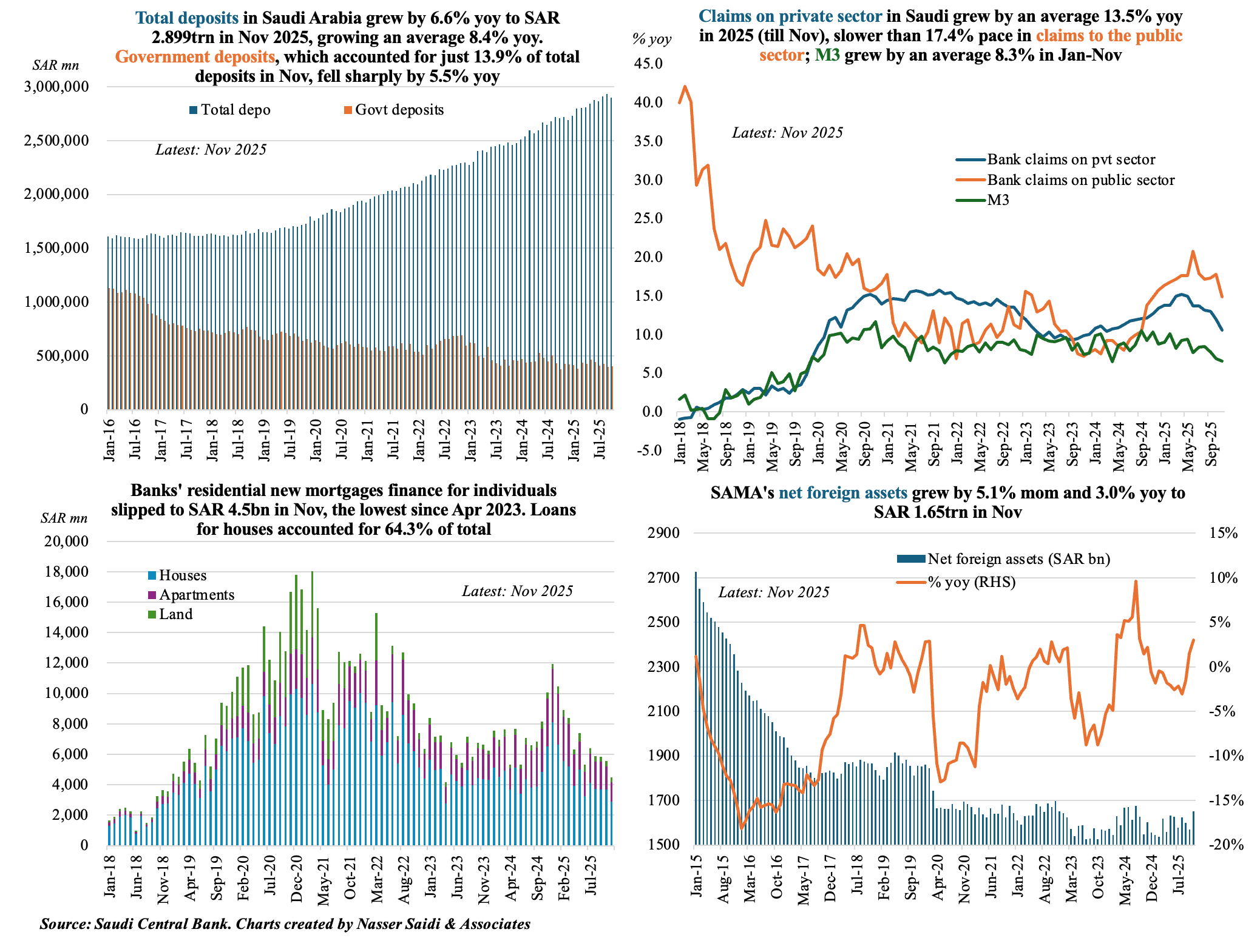 4. Broad money supply in Saudi Arabia grew by 6.6% yoy in Nov. Pace of credit growth is healthy (10.6% yoy in Nov & 13.5% avg in 2025) & has outpaced deposit growth (averaged 8.4% in Jan-Nov) for 22 straight months. Residential mortgage finance slipped to the lowest since Apr 2023. NFA increased to the most since Aug 2024.