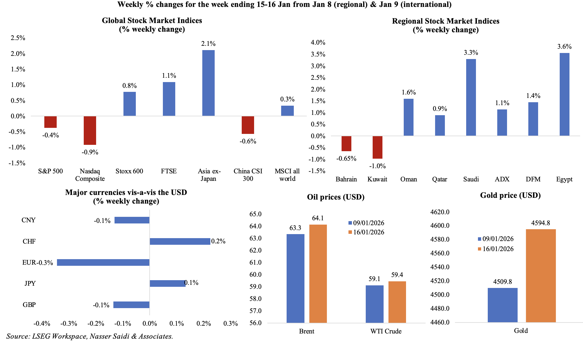 Equities markets were mixed last week, with declines in major indices in the US (despite strong tech and finance earnings) and China declining. Regional markets were also mixed given geopolitical tensions (news that US pulled personnel from bases in the Middle East) and some profit taking; Dubai and Abu Dhabi were up more than 1% from the week before while Qatar’s main market climbed to above the 11,000 level. The dollar index climbed to a 6-week high on Thursday while the JPY strengthened (from an 18-month low versus the USD) on comments from the finance minister that the country would “not rule out any options” to support the JPY. Oil prices edged up on supply fears (protests in Iran and President Trump’s hints of a potential military interventions) while gold price reached a record USD 4,642.72 on Wednesday before edging lower, while silver prices hit an all-time high of USD 93.57 (posting a 10%+ weekly gain).