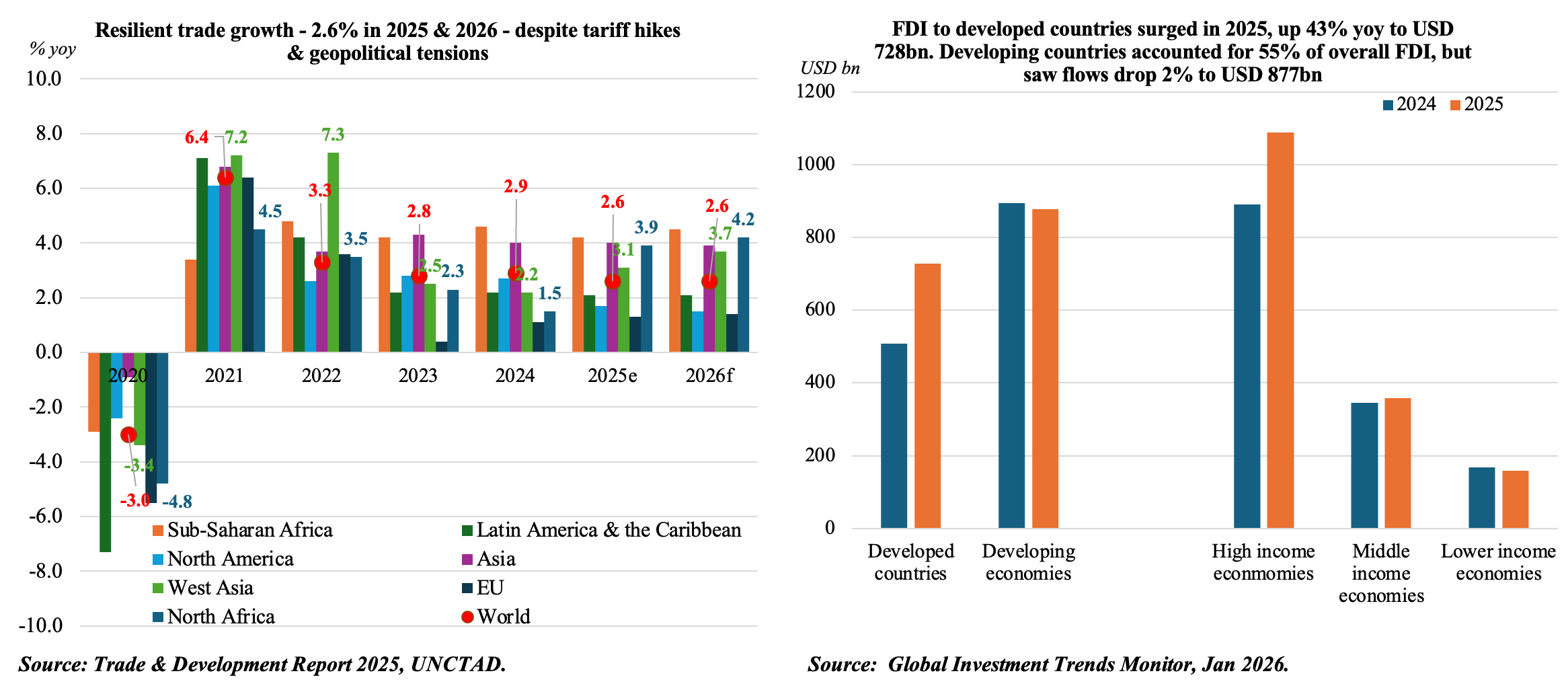 • Global FDI grew by 14% yoy to USD 1.6trn in 2025, rebounding after two consecutive years of declines. An important caveat is that financial centres drove the growth & without it, FDI grew just 5% (Source: UNCTAD)