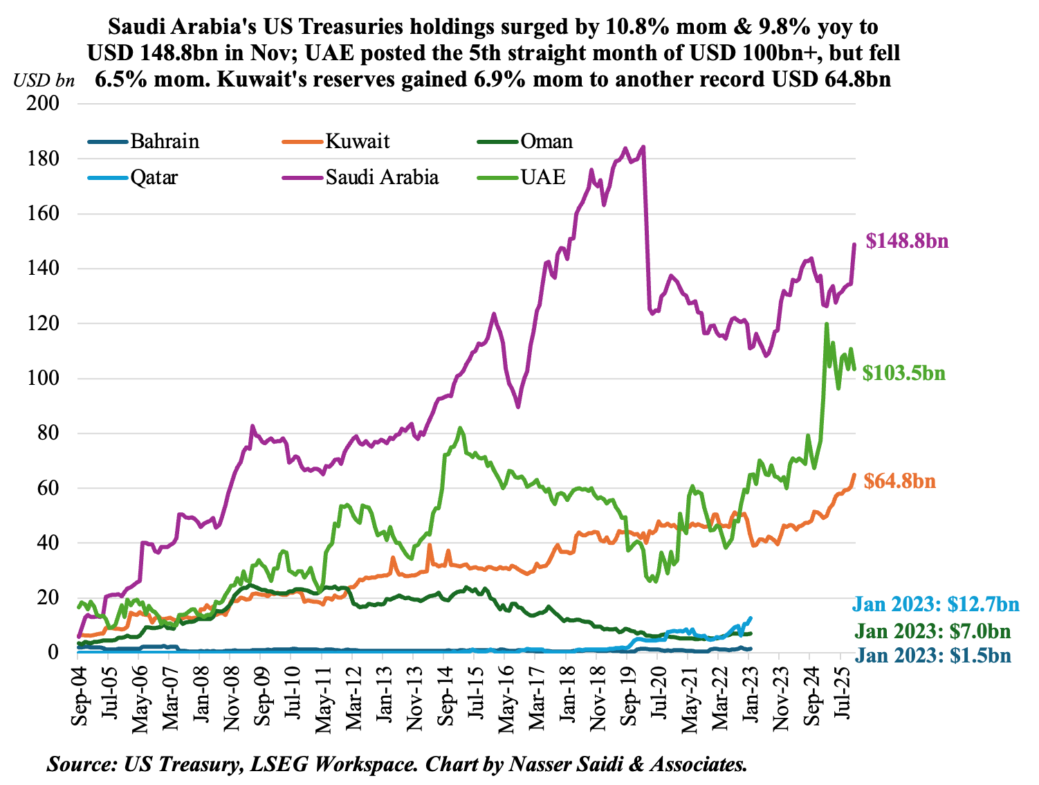 • In contrast, GCC has been increasing their holdings. Saudi holdings jumped 10.8% mom and 9.8% yoy to USD 148.8bn in Nov. UAE holdings dipped by 6.5% mom but stayed above USD 100bn for the fifth month in a row. Kuwait posted yet another record high in Nov (USD 64.8bn, up 6.9% mom & 26.6% yoy).