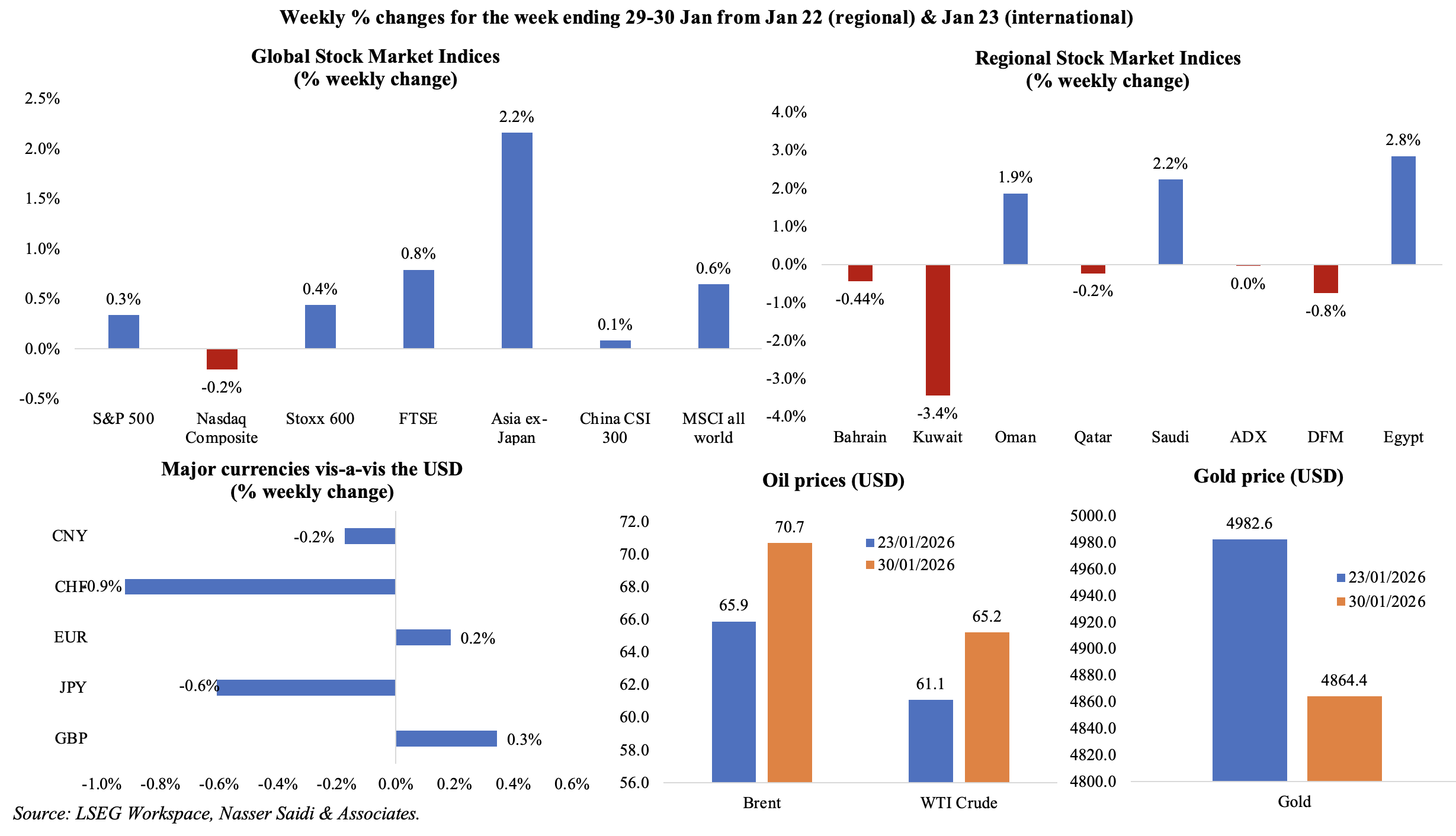 Global equities declined on Friday, but most ended the week on a positive note including the S&P 500 (the first in 3 weeks) and MSCI global stocks index gained 0.6%. Regional markets were mixed amid geopolitical worries namely, a possible US attack against Iran. The new Fed Chair announcement saw the USD gain, as concerns eased about Fed independence, while the yen was impacted by the threat of official intervention (after it came close to the 160-per-dollar mark). Oil prices neared a 6-month high on Friday, with Brent settling around the USD 70 a barrel mark. Gold hit a record of nearly USD 5,600 an ounce on Thursday before plunging almost 9% on Friday. Silver prices slumped over 26% bringing prices to around USD 85 an ounce.