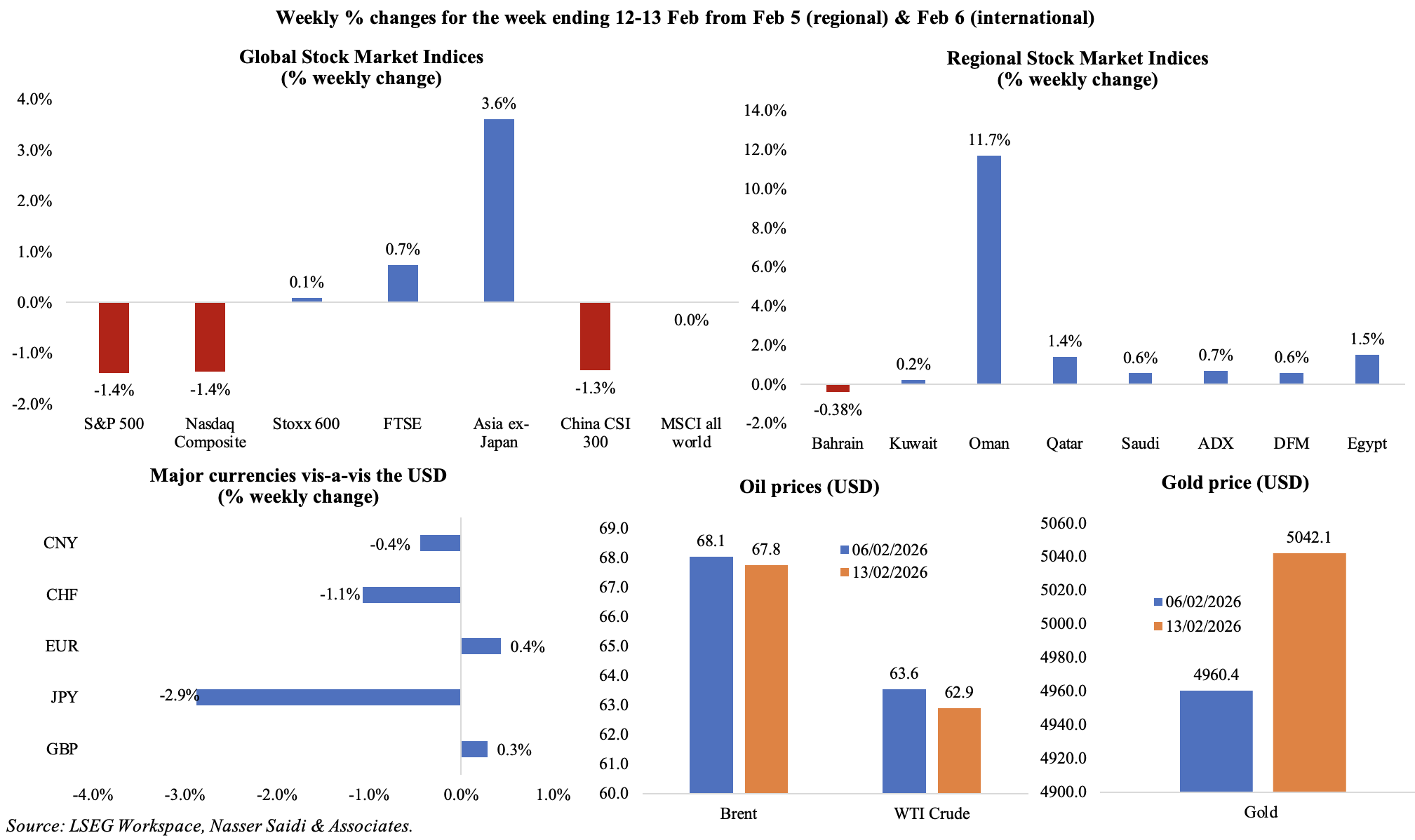 Global equities were mostly down last week, with the US indices down by 1.4% from the week prior (on tech sell-offs). Investors’ AI concerns have in the past affected performance of tech stocks; however, last week, the “AI scare trade” widened into other sectors as well including wealth management, legal, consulting, transportation and logistics given fears of how quickly AI could transform/ disrupt such sectors too. Though European equity markets were also affected by AI worries, both Stoxx and FTSE managed to eke some gains. Asia ex-Japan posted the largest gains after hitting record highs (3.6%). Regional markets gained last week – Oman was the main story, crossing 7000-points (+11.7% weekly and rising to an 11-year peak), with banking and investment firms leading gains. Japan PM’s historic election win led JPY to dominate activity last week (nearly 3% last week vis-à-vis the USD). Oil prices edged down slightly (Brent by 0.5% and WTI by 1%) on expectation that the OPEC+ may be heading towards production increases while gold price increased to over USD 5000 after a volatile week.