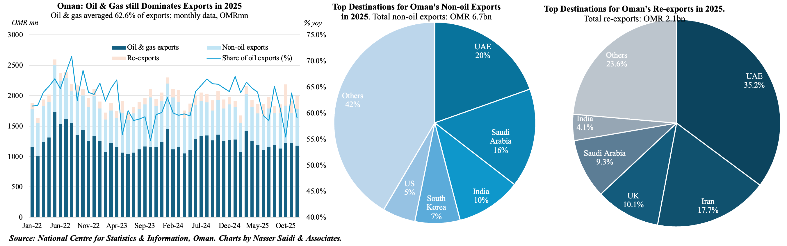 - Oman’s re-export growth has been enabled by growth in its SEZs (e.g. Duqm) and increased rail and road connectivity with Saudi and the UAE. Re-exports to KSA surged 313.2% to OMR 207mn in 2025.