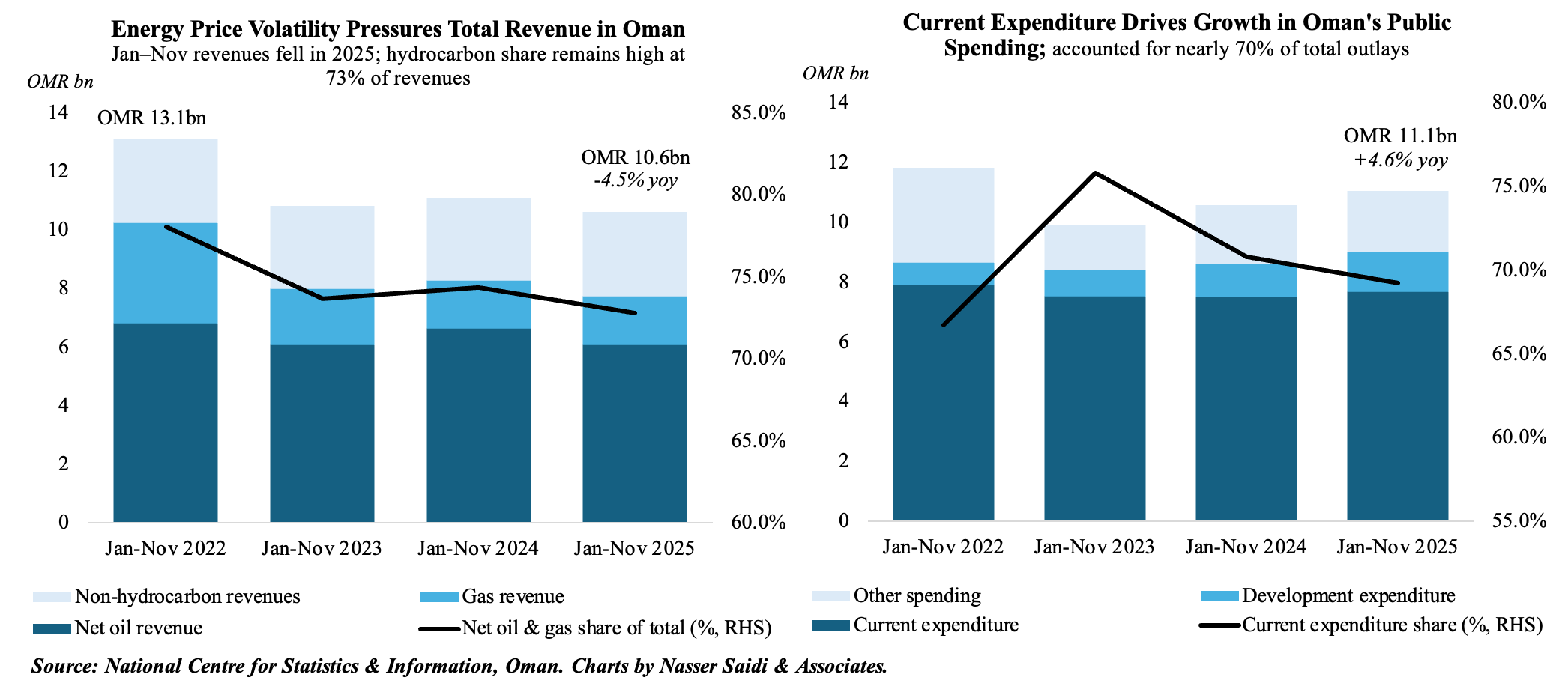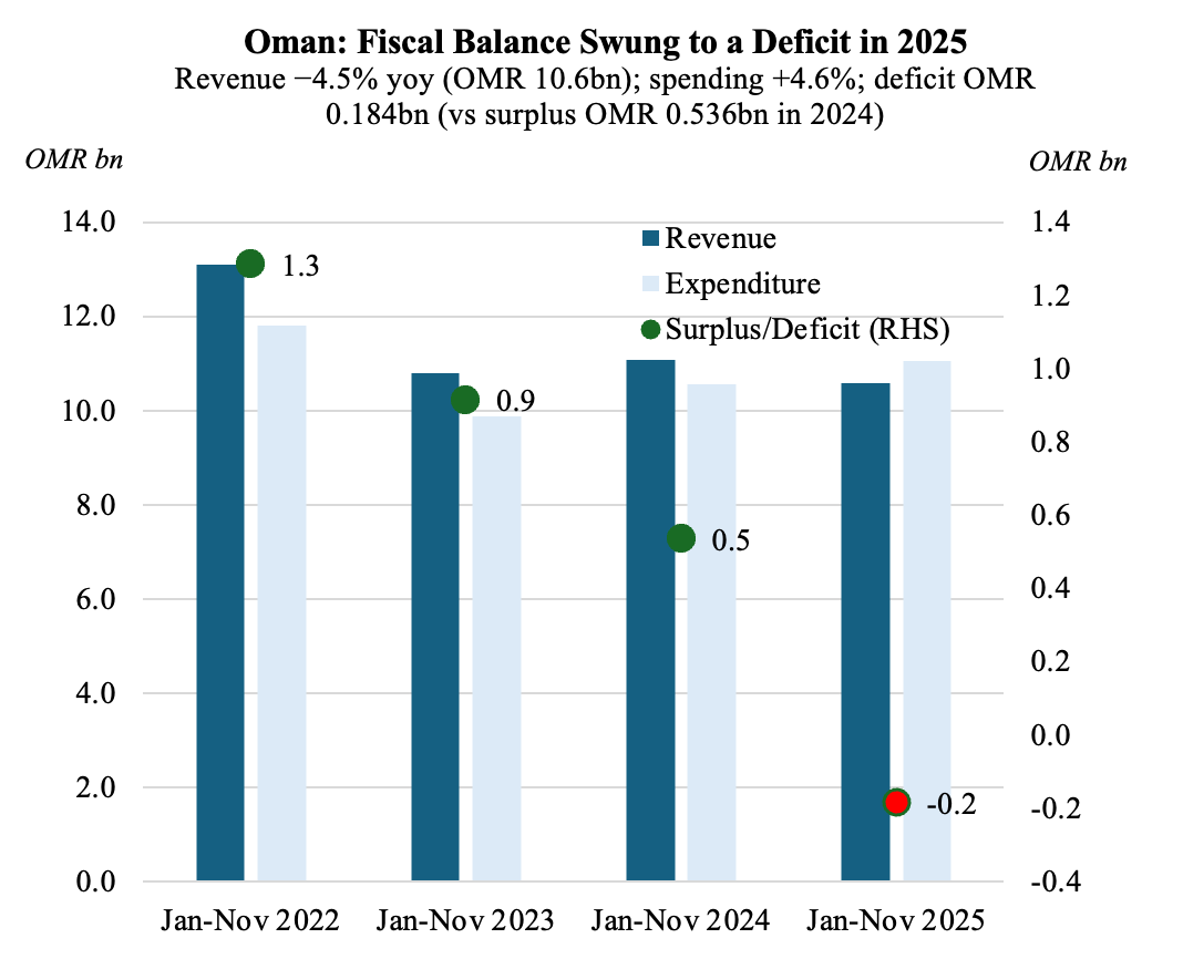 4. Oman’s fiscal deficit of OMR 184mn as of end-Nov ‘25 compares to surplus OMR 536mn in Jan-Nov ‘24; Non-hydrocarbon accounts for 27.2% of total receipts