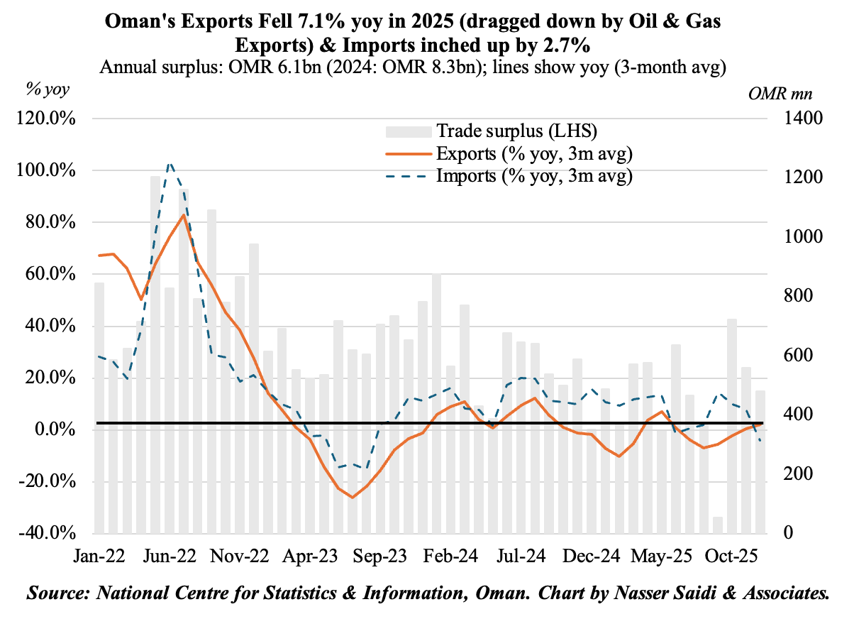 - While total merchandise exports saw a decline (-7.1% yoy to OMR 23.3bn in 2025) due to a 15.2% drop in oil and gas exports, imports grew by 2.7%, allowing the trade surplus to remain healthy at OMR 6.1bn.