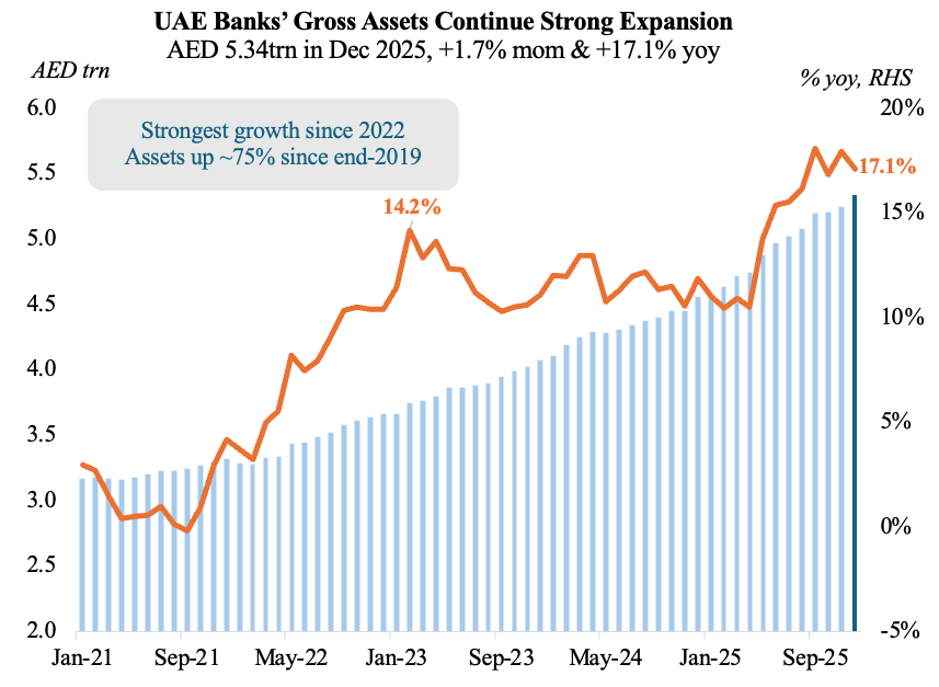 - UAE gross banking assets grew 17.1% yoy to AED 5.34trn at end-2025, thanks to increase in credit demand from the non-oil sectors & UAE’s expanding role as a hub for regional and global trade flows.