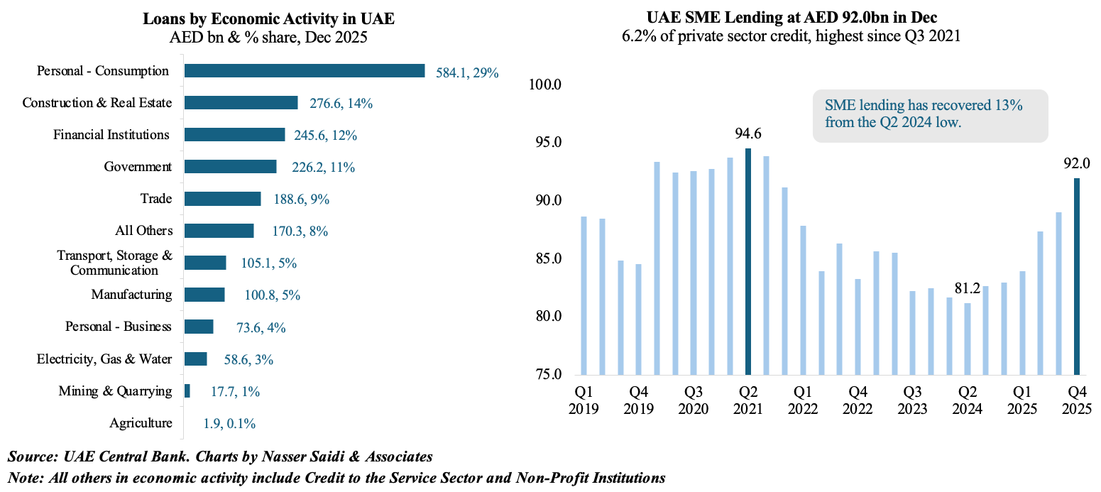 - Real estate & construction accounted for 13.5% of total lending in Dec 2025 (vs. 20% in 2021); but the fastest loan growth was reported in credit disbursed to financial services, trade and manufacturing sectors. UAE’s Comprehensive Economic Partnership Agreements (CEPAs) have also boosted trade-related financing requirements.