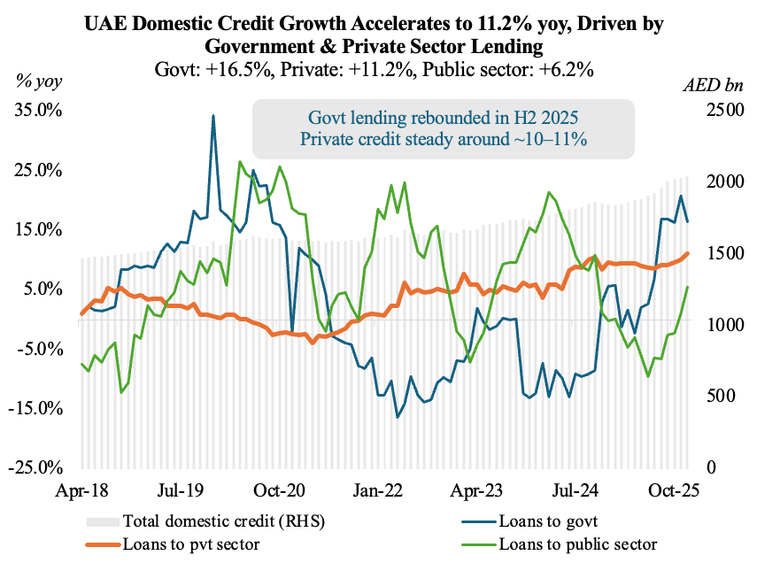 - Credit to UAE’s private sector, which grew by 11.2% yoy to AED 1.5trn in 2025, represented 72.8% of total domestic lending.