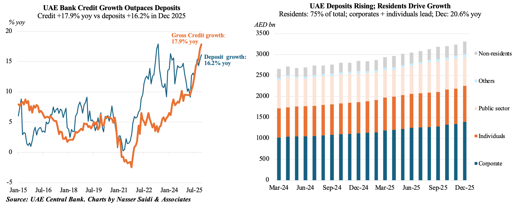 - Total deposits grew by 16.2% to AED 3.3trn at end-2025, partially from non-resident inflows (+21.2% in Dec) – underscoring the UAE’s global safe haven status amid geopolitical worries.