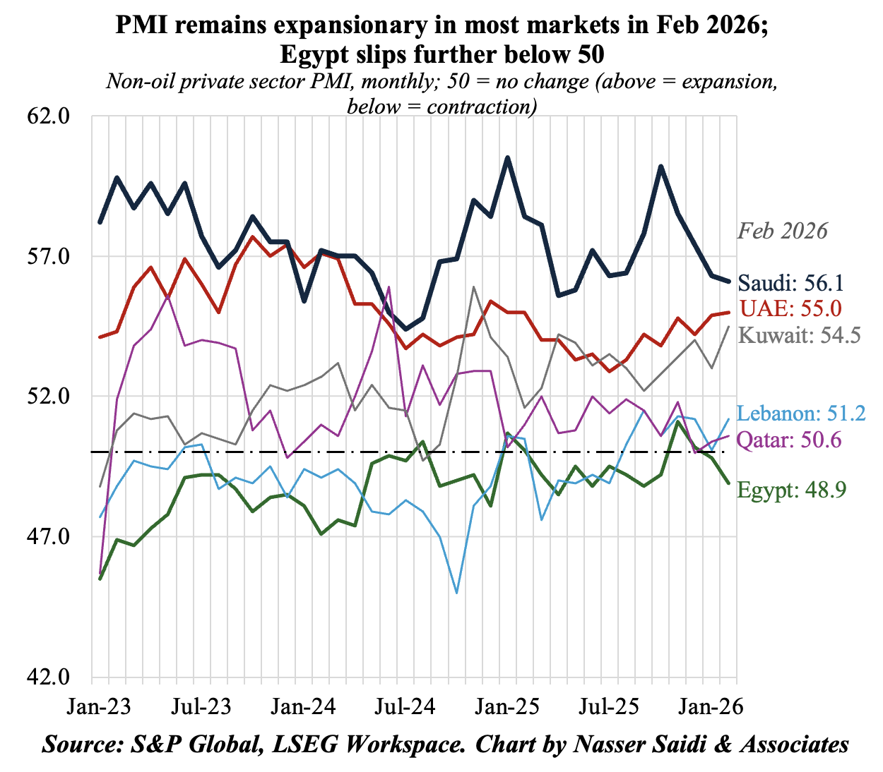 - Input price inflation rose with Kuwait and Qatar at 9- and 14-month highs respectively while Saudi posted a survey-record jump in wages. Egypt and Lebanon’s purchase price inflation rose to the highest since May and Sep 2025, due to higher import costs (for both) and petrol taxes (for LB); UAE input prices rose at the slowest pace since Oct.