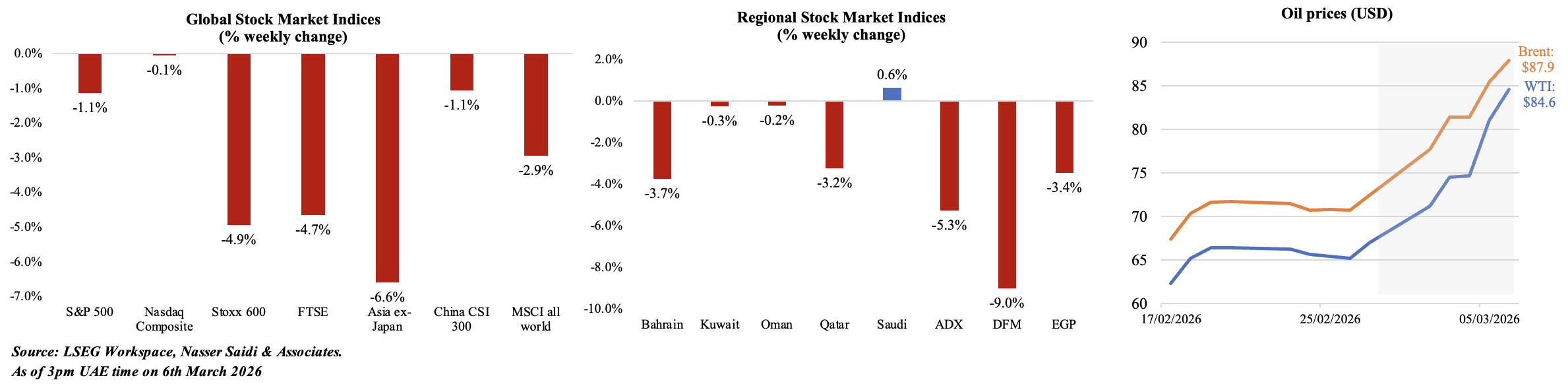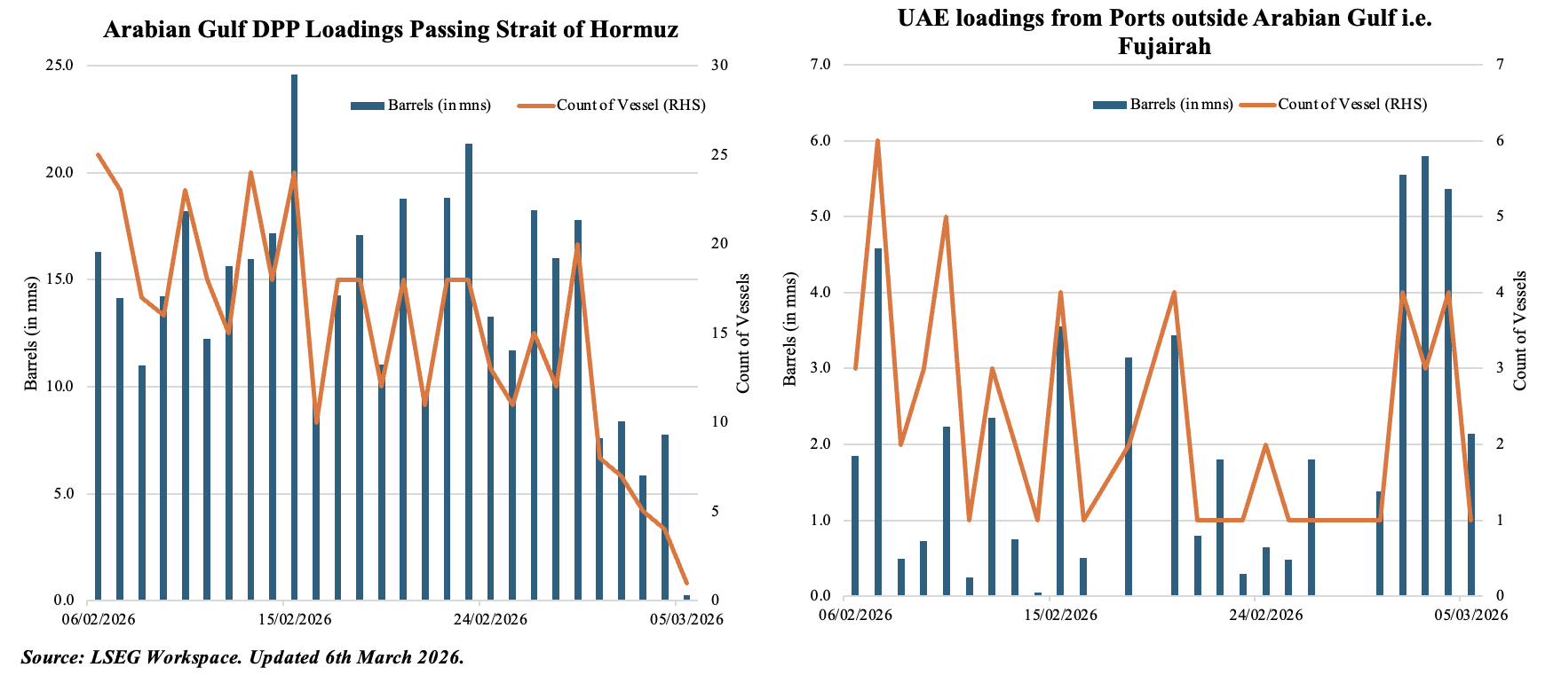 - Energy market volatility: Impact on oil supply from two fronts: (a) inability to transport oil from recent hikes in production due to the impact on Strait of Hormuz; (b) if Middle East energy infrastructure are targeted and hit, production could stop + it will also delay how quickly production can come back online when a ceasefire is declared. Both Brent & WTI have crossed USD 85 per barrel as of Mar 6th (3pm UAE time), but prolonged disruption could drive oil closer to USD 100 per barrel.