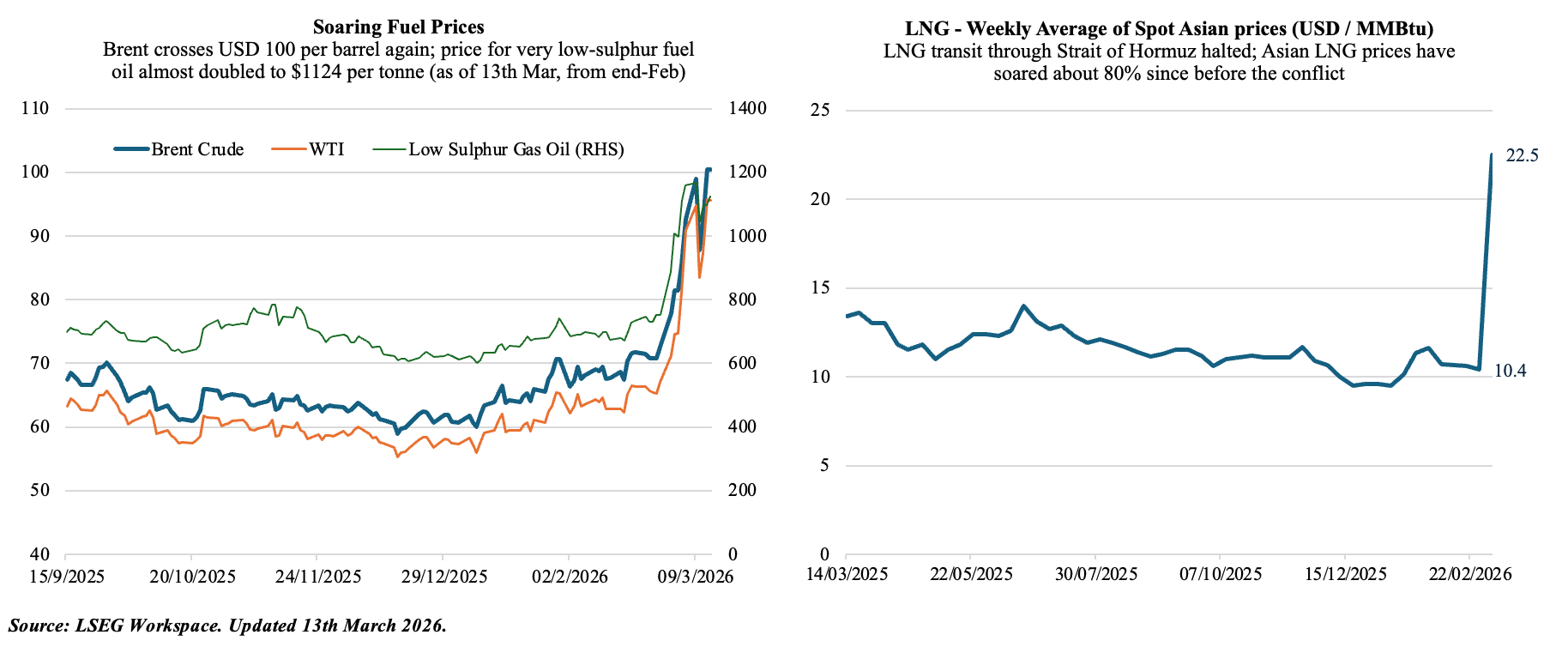 - This supply risk has sparked a jump in energy prices: with Brent crude surging past USD 100 and a jump in the average spot Asian prices for LNG (up more than 70%+ since before the conflict). Cost of marine fuel used by ships has also risen: Singapore’s bunker prices have doubled (raising refuelling costs), with Low-Sulphur Gas Oil crossing USD 1,100 per tonne.