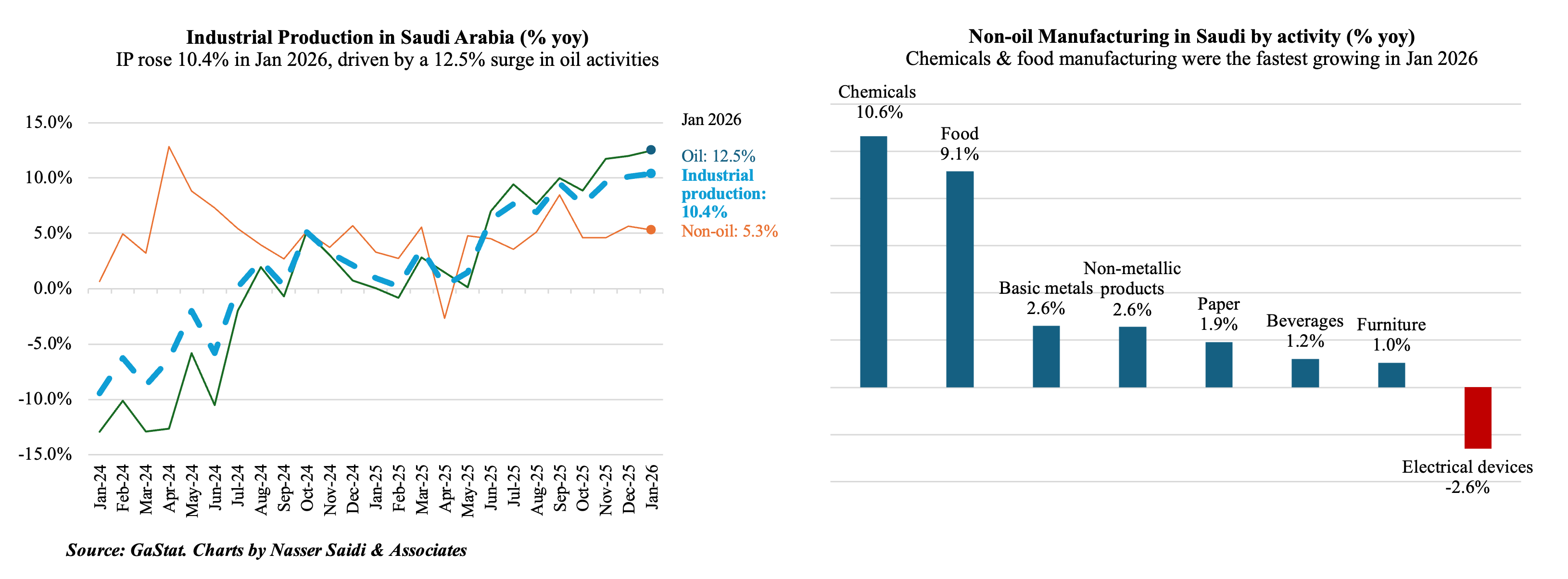 7. Robust industrial momentum pre-war: Saudi IP grew 10.4% yoy in Jan 2026