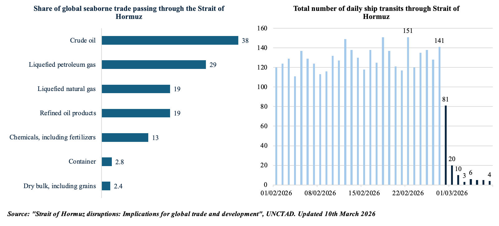 - UNCTAD: In addition to 25% of global seaborne oil trade passing through the Strait (or 20mn barrels per day), it accounted for one-third of global seaborne fertilizer exports (about 16mn tonnes).