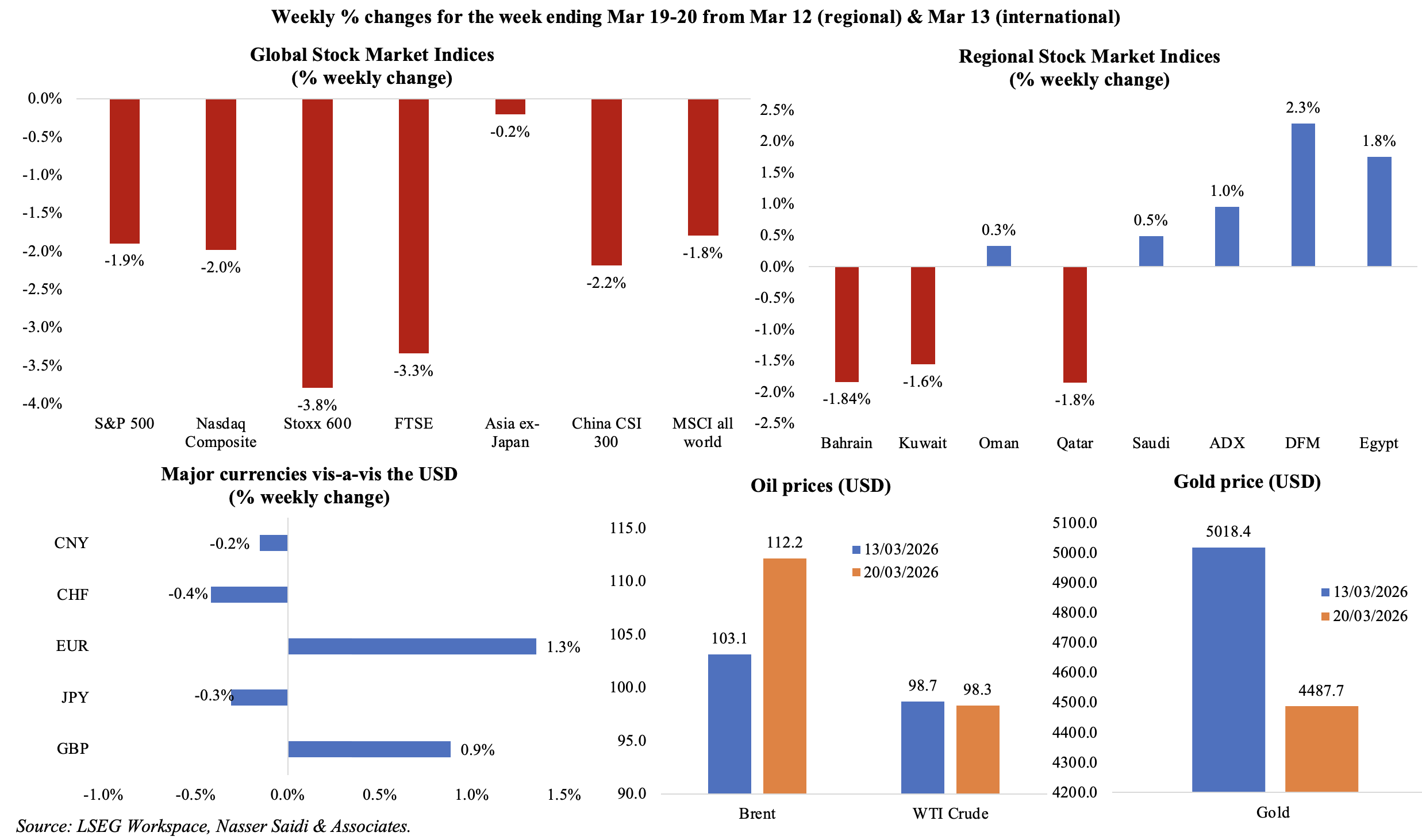 Global market indices were retreating as investor fears rise that war-driven inflation will necessitate a higher-for-longer monetary stance, effectively stalling global growth in 2026. In contrast to global weakness, Middle East equities and particularly the UAE (following its central bank’s stimulus package) ended on a positive note; Qatar, Bahrain and Kuwait fell by more than 1.5% from the week before. The USD remained a safe haven in the backdrop of the war, while the GBP and the EUR gained on hawkish rhetoric from the Bank of England and the ECB. Oil benchmarks have surged to record highs as the conflict shifts from a transport blockade to the physical destruction of oil & gas production and processing infrastructure. Brent oil price ended Friday at USD 112.19 per barrel (some 50% yoy), and the highest since Jul 2022 while the WTI’s discount to Brent hit its widest in 11 years mid-week. European natural gas prices have nearly doubled since the war started while UK gas is now at around 151pence per therm versus 80pence per therm pre-war. Gold posted a weekly decline, suppressed by a surging USD and a hawkish Fed.