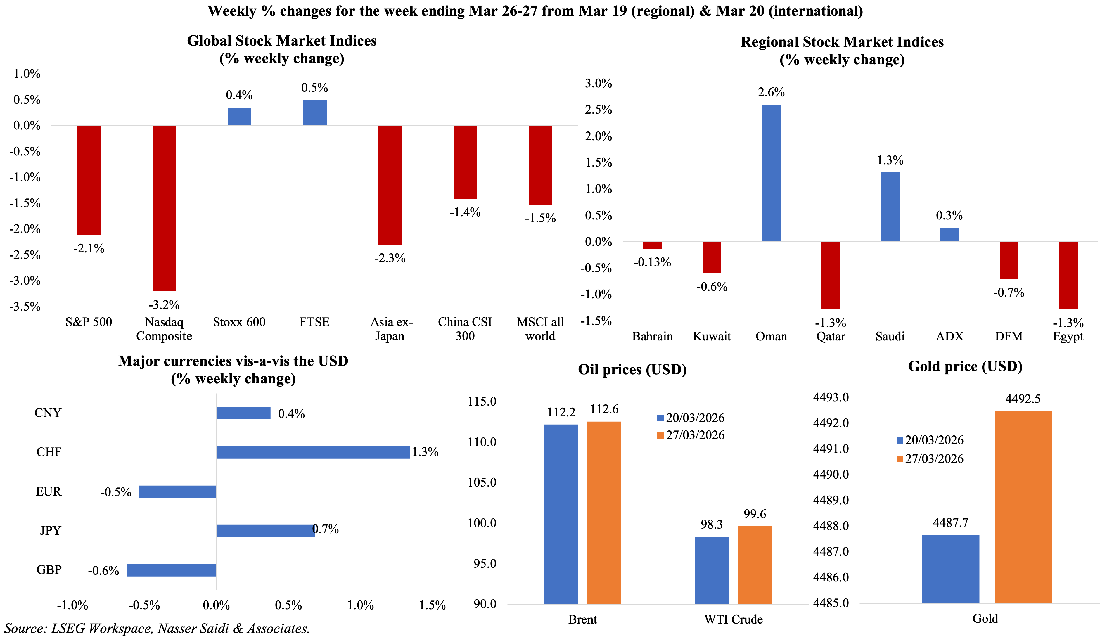Global equities remained volatile and slid amid rising geopolitical uncertainty and shifting rate expectations. Regional markets were mixed amid the 4-week long war with Iran: Oman is relatively unaffected, supporting its equity index performance, while news of a potential ceasefire supported Saudi markets (though this became more uncertain on Friday, leading to DFM’s weekly drop). The USD continued to play a safe-haven role; GBP posted its worst monthly loss since Oct 2025 and USD rose to its highest level against the JPY since July 2024; in emerging markets, the INR hit a record low of 94.84 per dollar, its most severe drop since 2011-12. Oil prices softened following a pause in US actions against Iranian energy infrastructure but ended the weekly slightly higher on lingering doubts of de-escalation; prices have surged to over USD 115 earlier today (Mar 30th). Gold prices rose last week after falling to a four-month low on Monday.