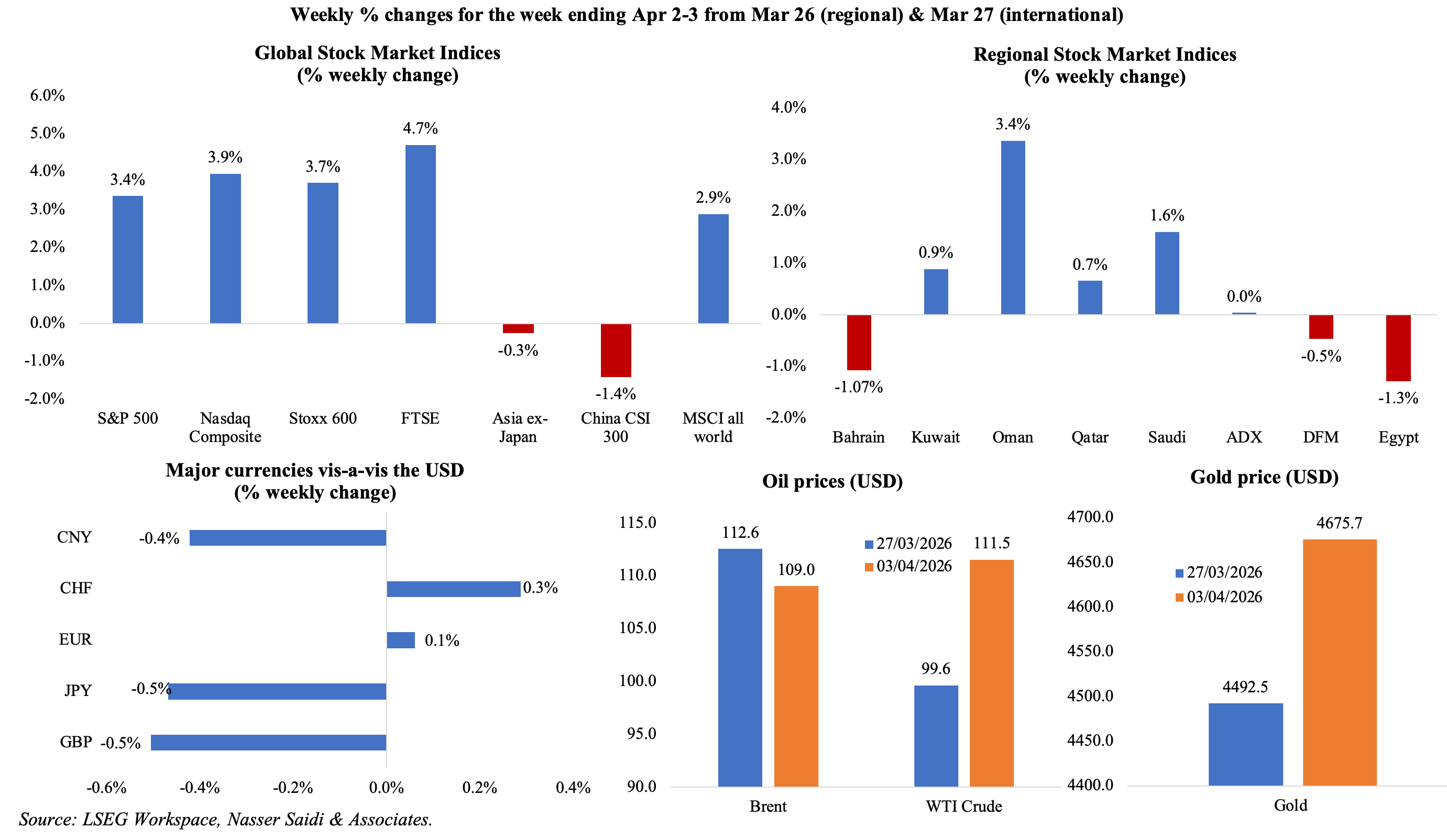 Global equities have been highly volatile with the many (sometimes threatening) war-related messages and headlines. US and European markets closed higher last week (before breaking for the Easter holidays); all markets remain on edge, though Asian markets (including China and Japan) are feeling the weight of potential supply chain disruptions given high dependence on Gulf for energy, fertilisers and petrochemicals. GCC equity markets and investors are weighing the risks of a prolonged Middle East conflict and waiting for clarity on ceasefire talks; less-affected Oman outperformed its peers last week, while UAE equities closed mixed despite news of fiscal support. The dollar continues to behave as a safe haven, while the INR stabilised post its record low after the RBI intervened to curb speculation; the JPY is back near intervention territory. Oil prices are still hovering around the USD 110 mark, while gold prices climbed last week.